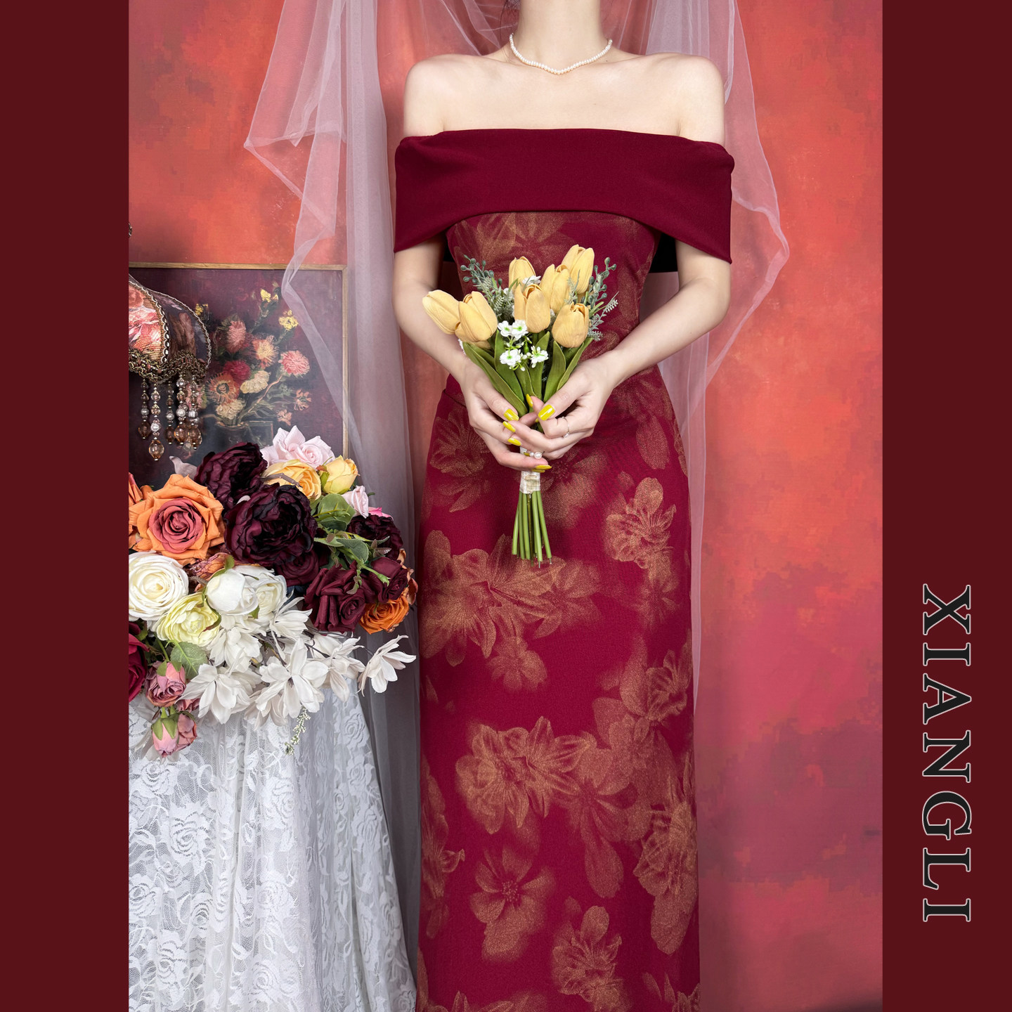 巷里法式复古一字肩红色连衣裙女秋冬长袖气质显瘦订婚敬酒礼服裙