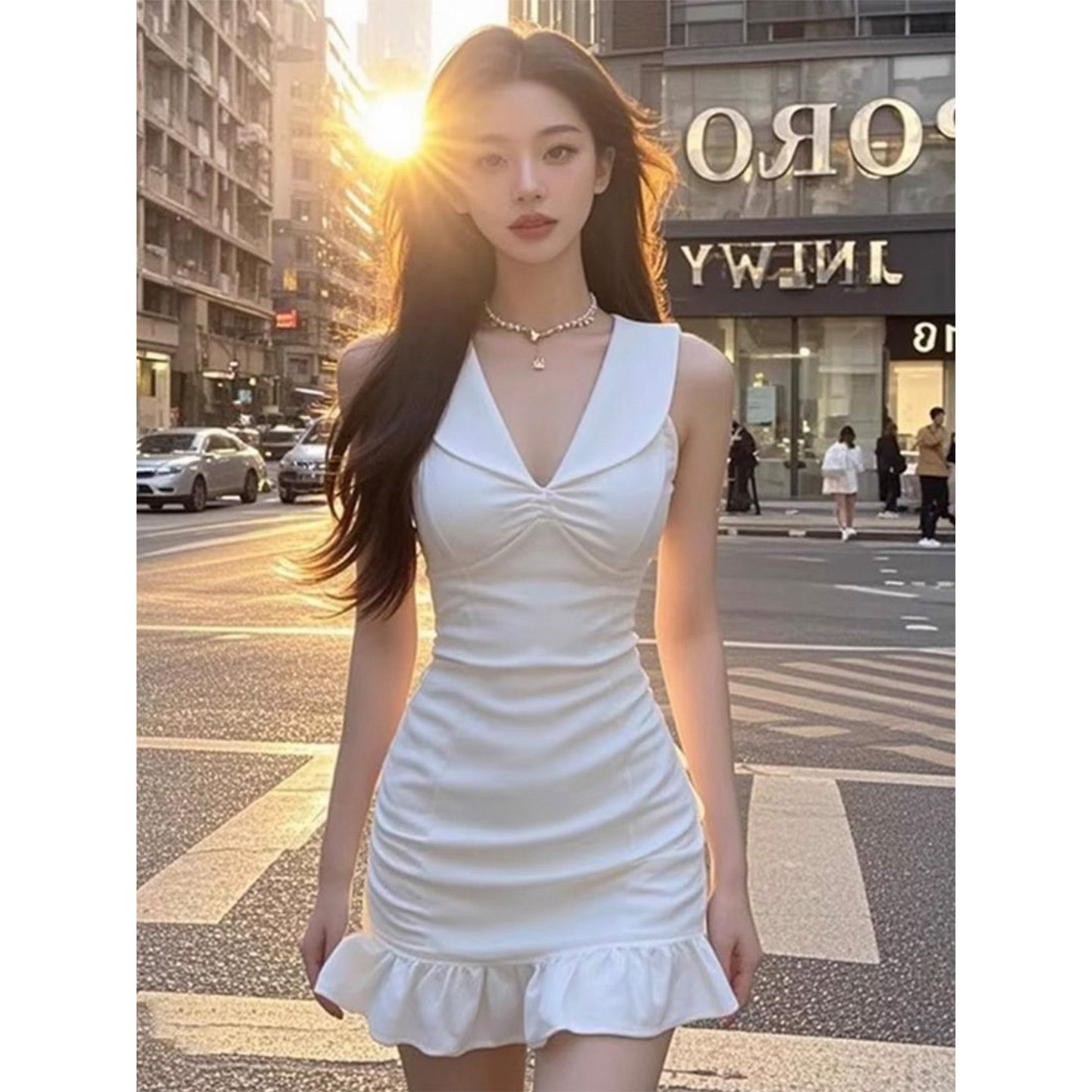 气质性感白色v领无袖连衣裙女千金名媛高级感收腰显瘦短款包臀裙