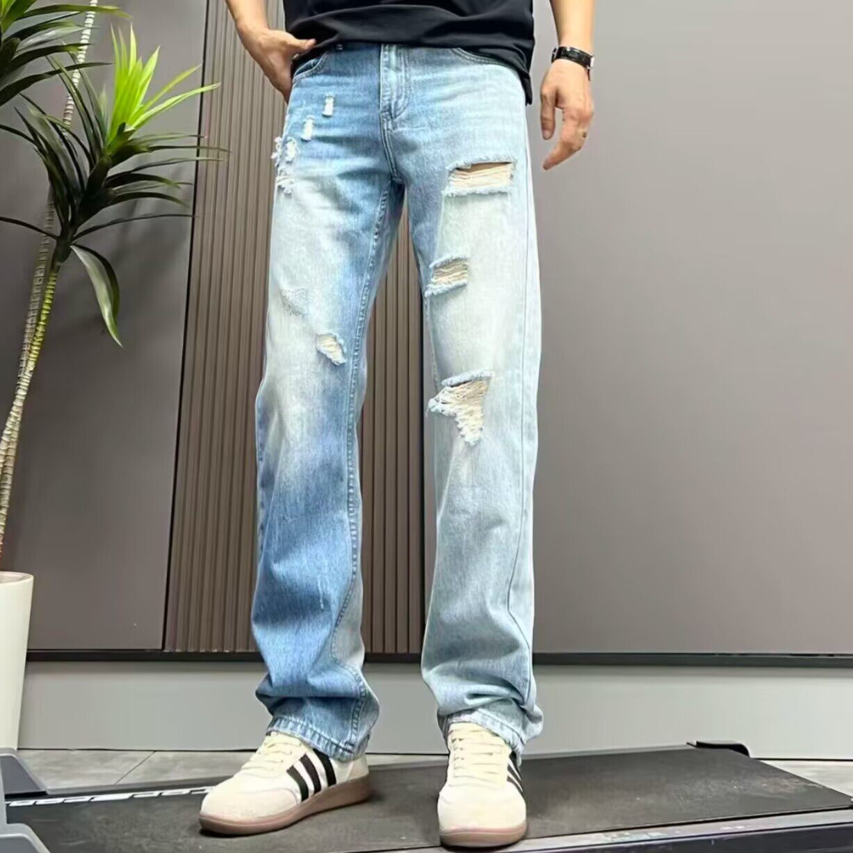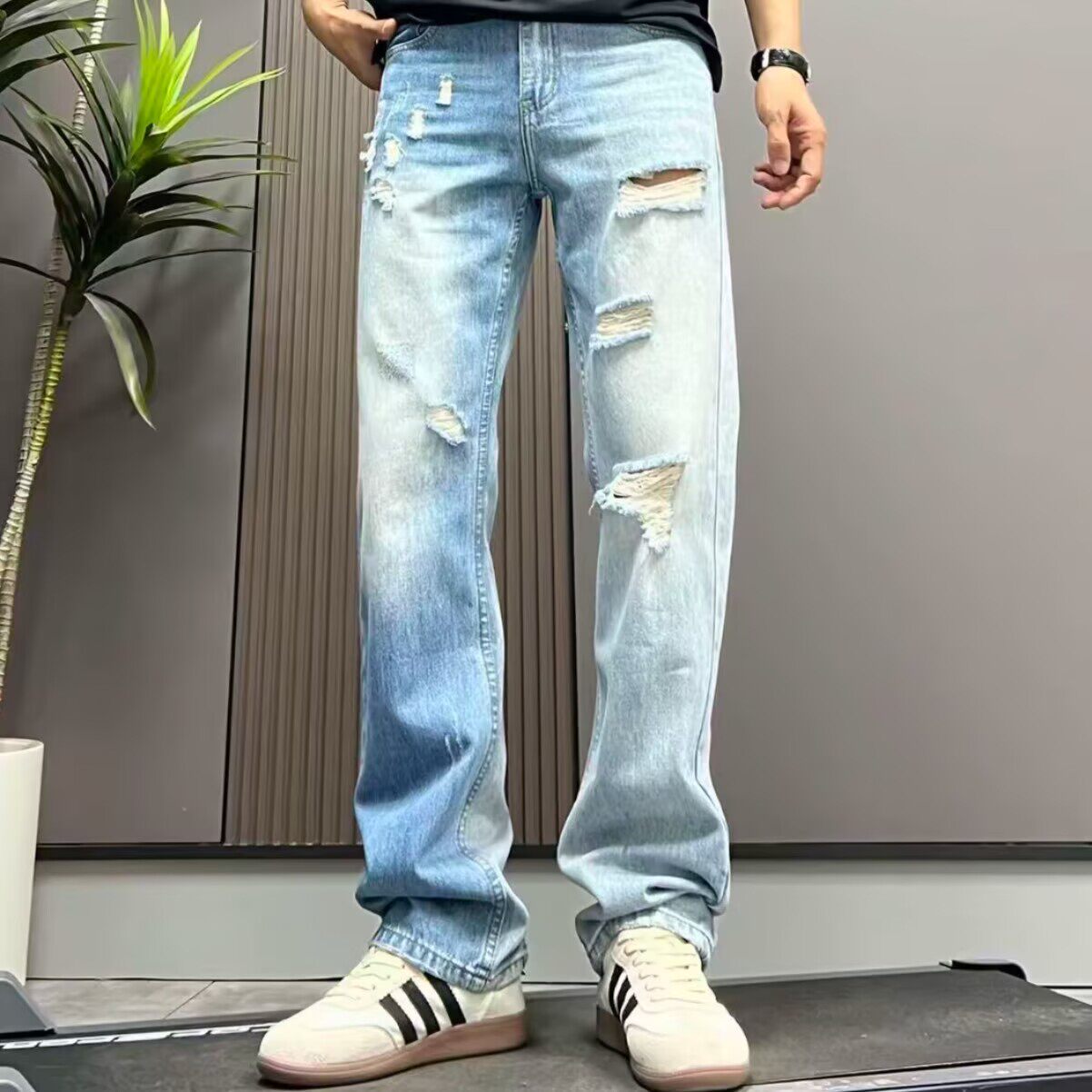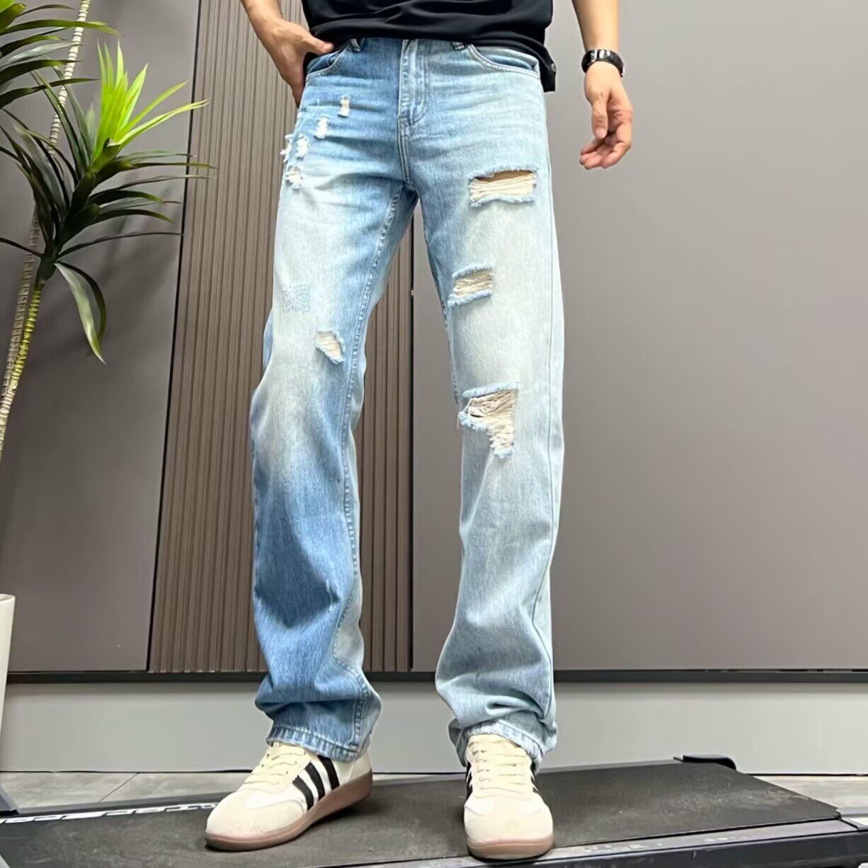 高级感破洞牛仔裤男宽松水洗浅蓝色刮烂直筒长裤2026春夏新款裤子