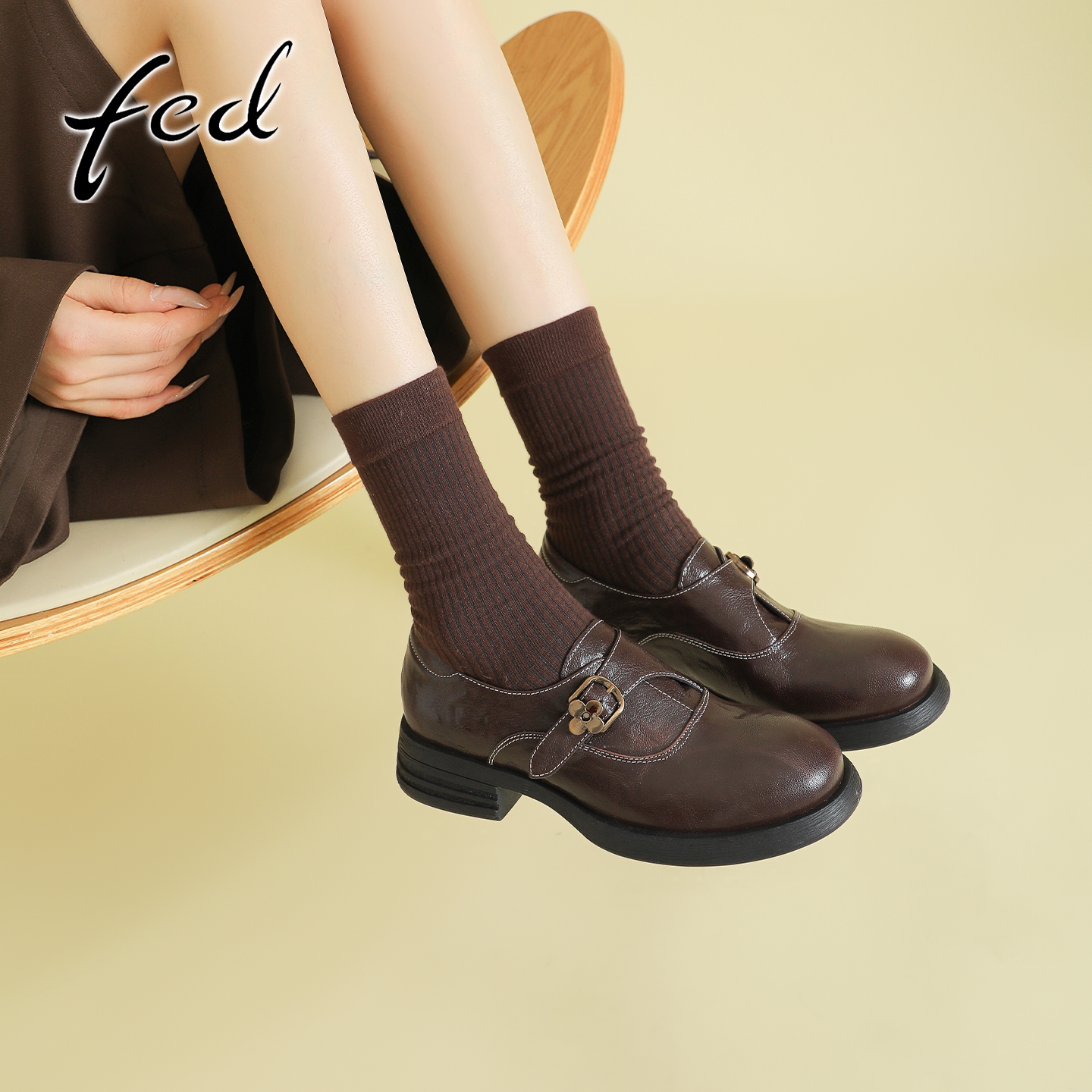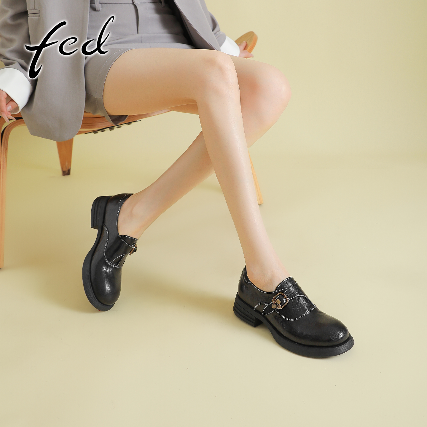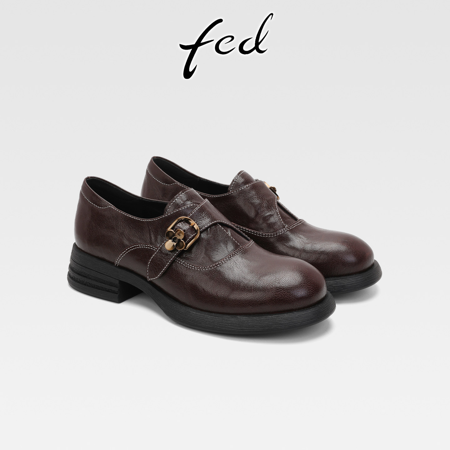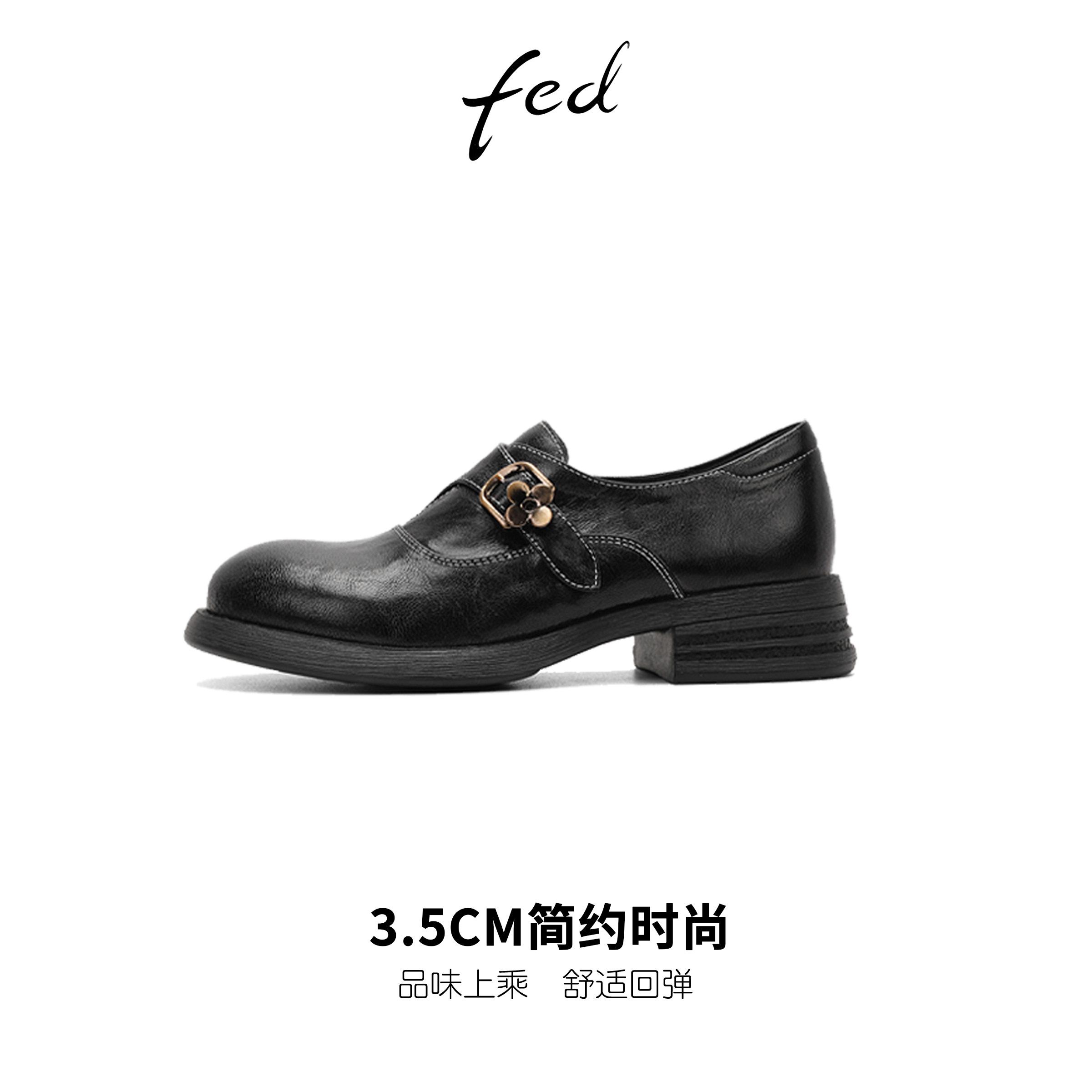 fed英伦风真皮厚底乐福鞋女复古皮带扣小皮鞋一脚蹬圆头深口单鞋
