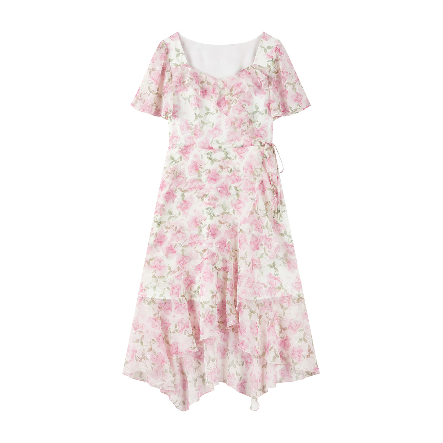 秋水伊人气质方领碎花连衣裙2026年夏新款女收腰A字荷叶边中长裙