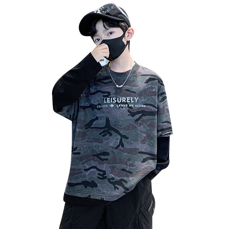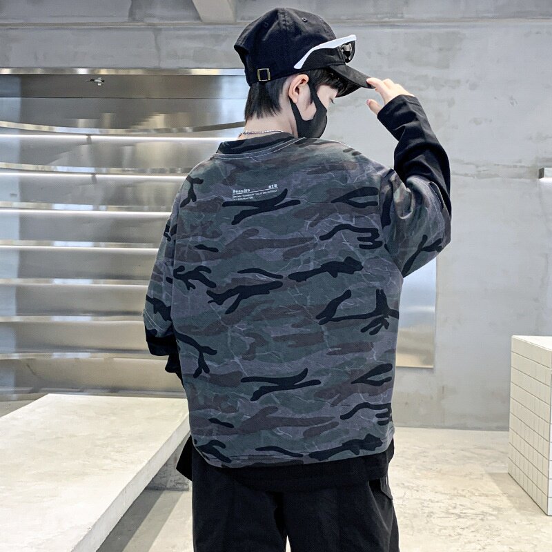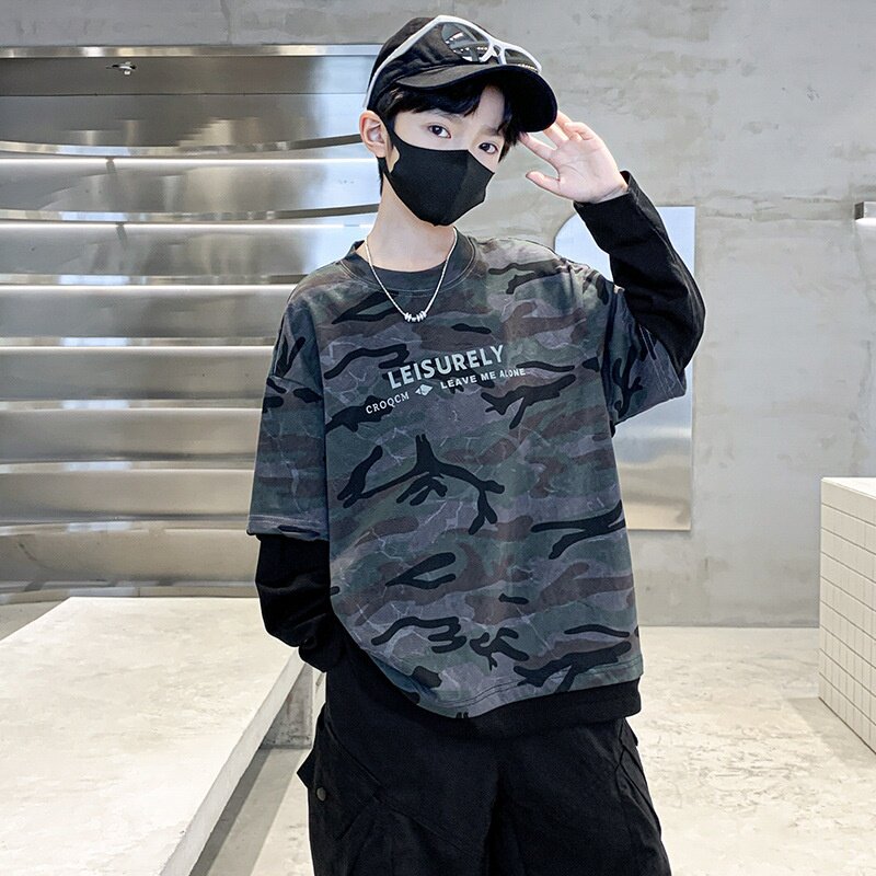 男童春装痞帅假两件长袖迷彩T恤2026新款儿童春秋打底衫男孩上衣T