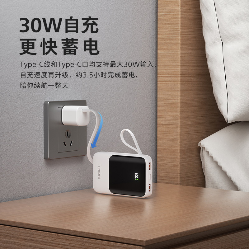 飞利浦2000毫安充电宝自带四线移动电源手机大容量22.5W快充PD35W苹果快充小巧便携可上飞机高铁火车