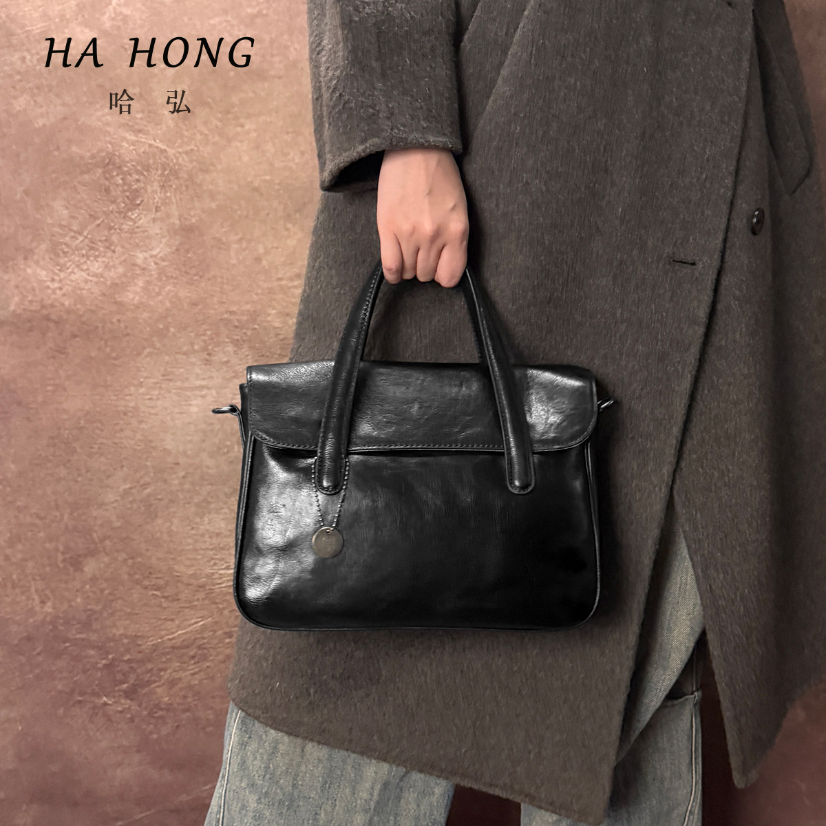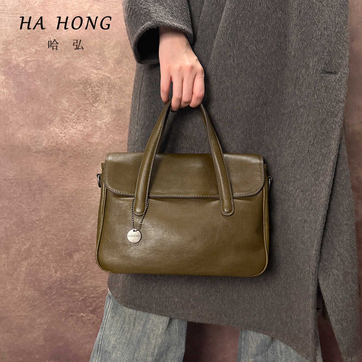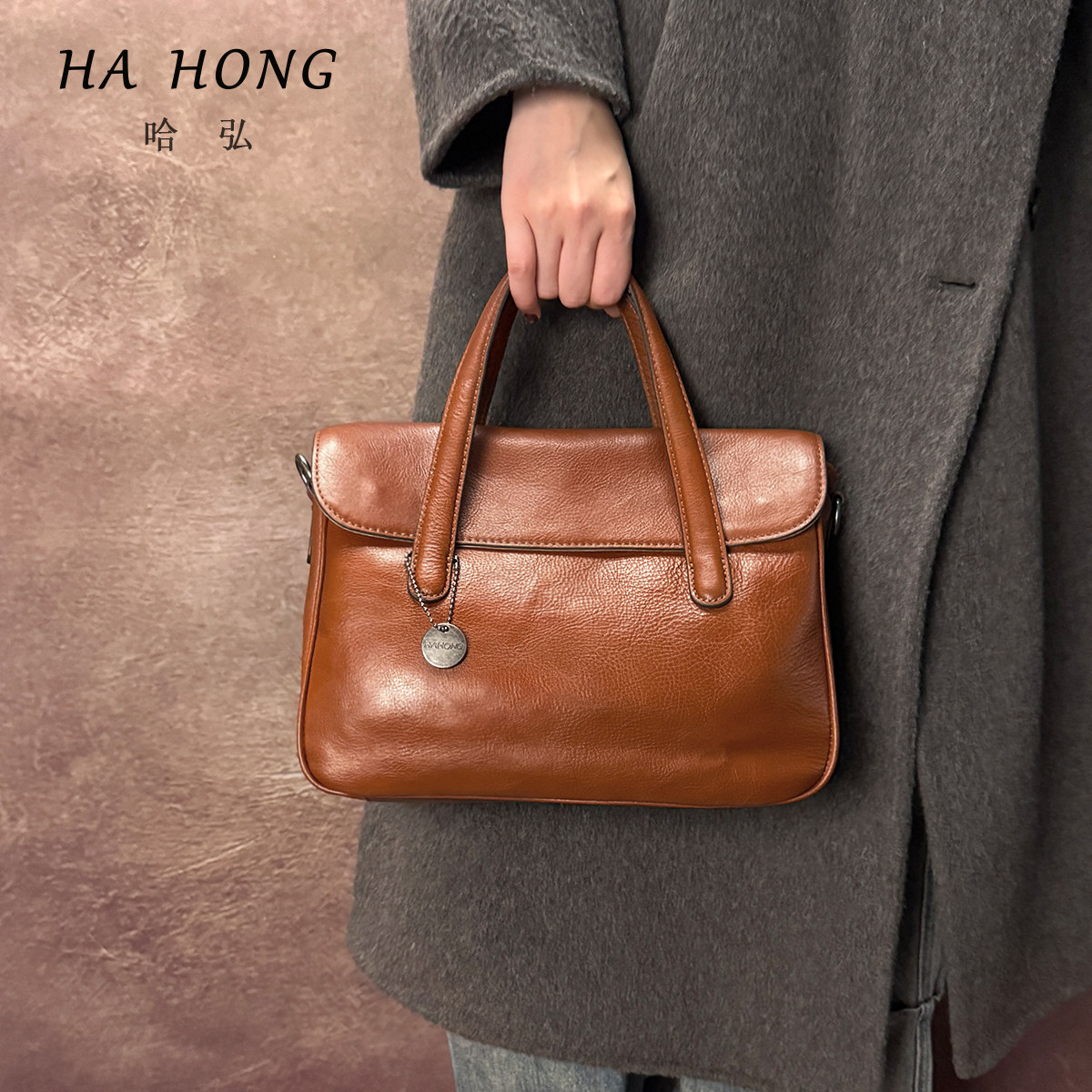 哈弘头层牛皮新款邮差包日常斜挎包休闲手提复古简约大容量公文包
