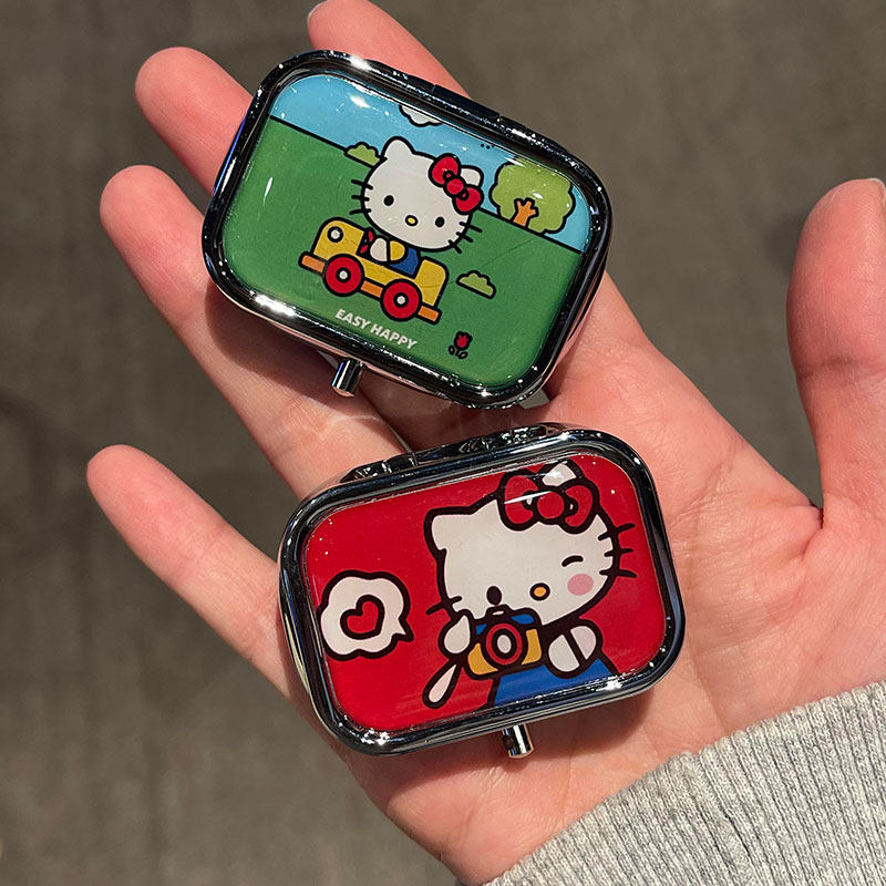 可爱kitty迷你便携式随身小药盒药丸盒内两格金属盒首饰盒带镜片