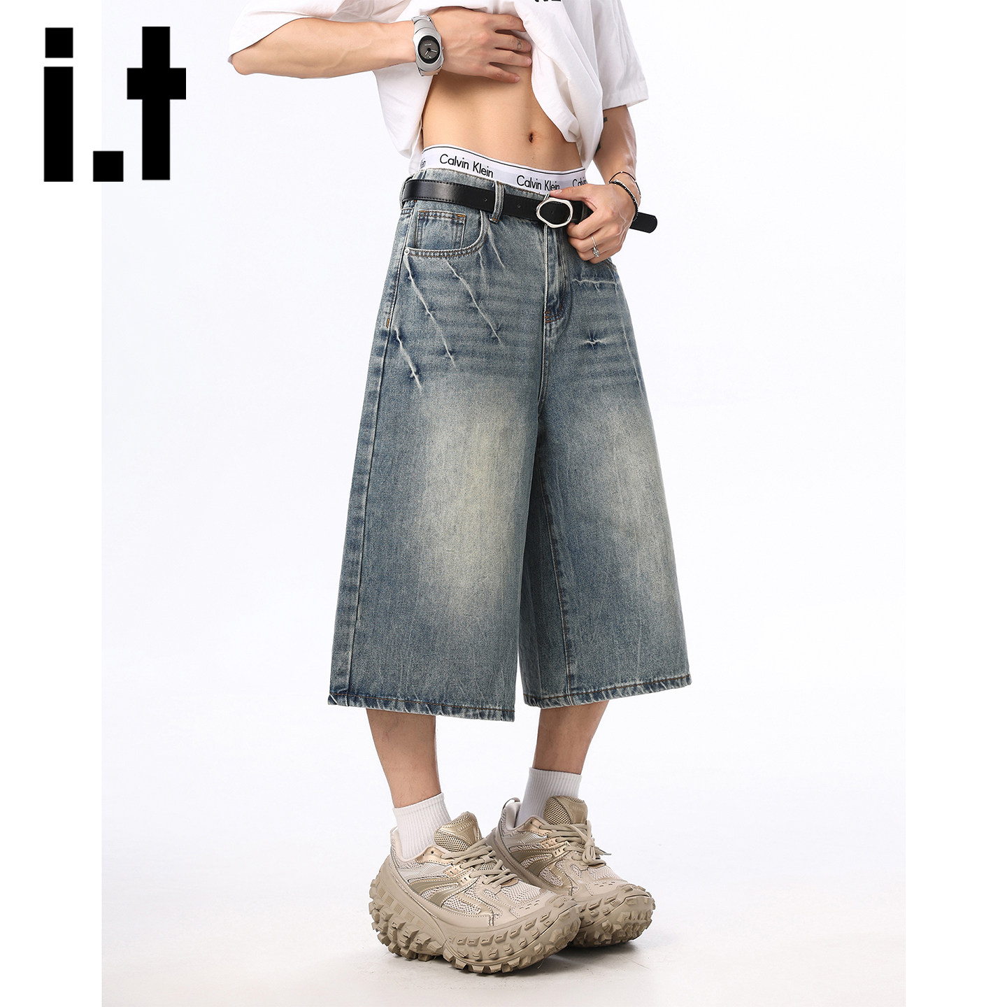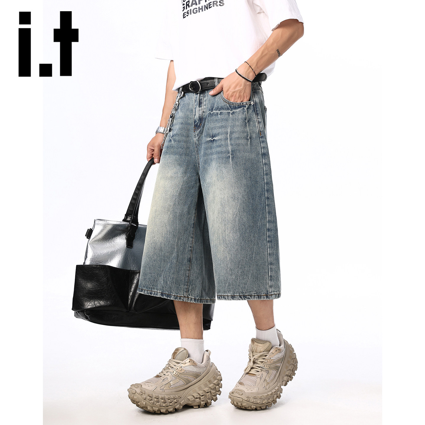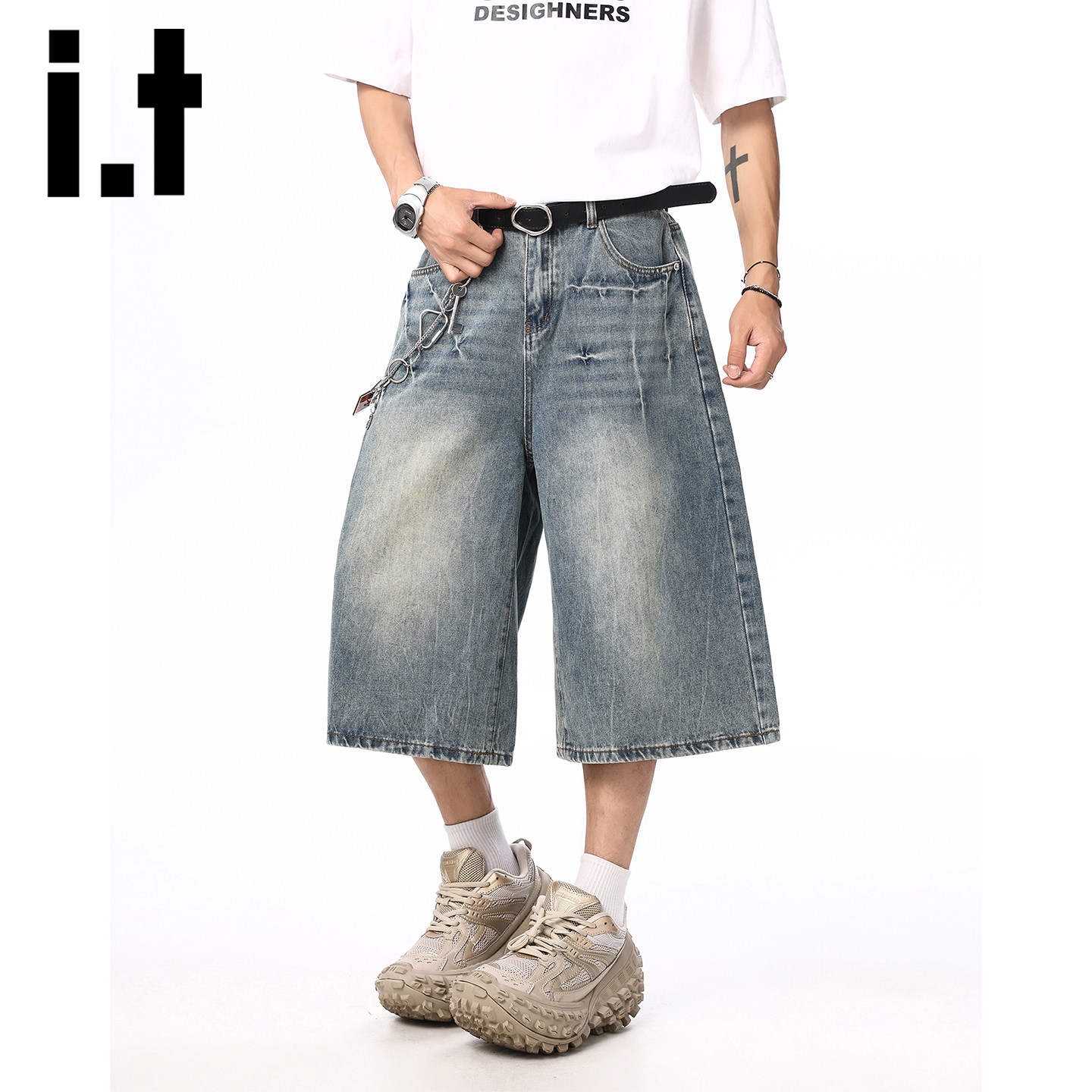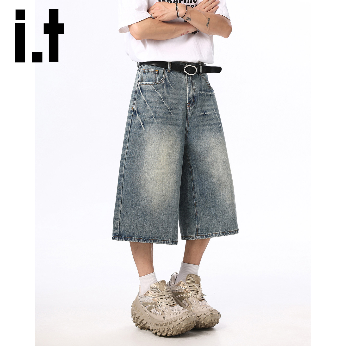 it izzue美式复古洗水牛仔七分裤男款夏季宽松休闲直筒阔腿短裤Y