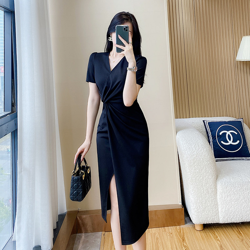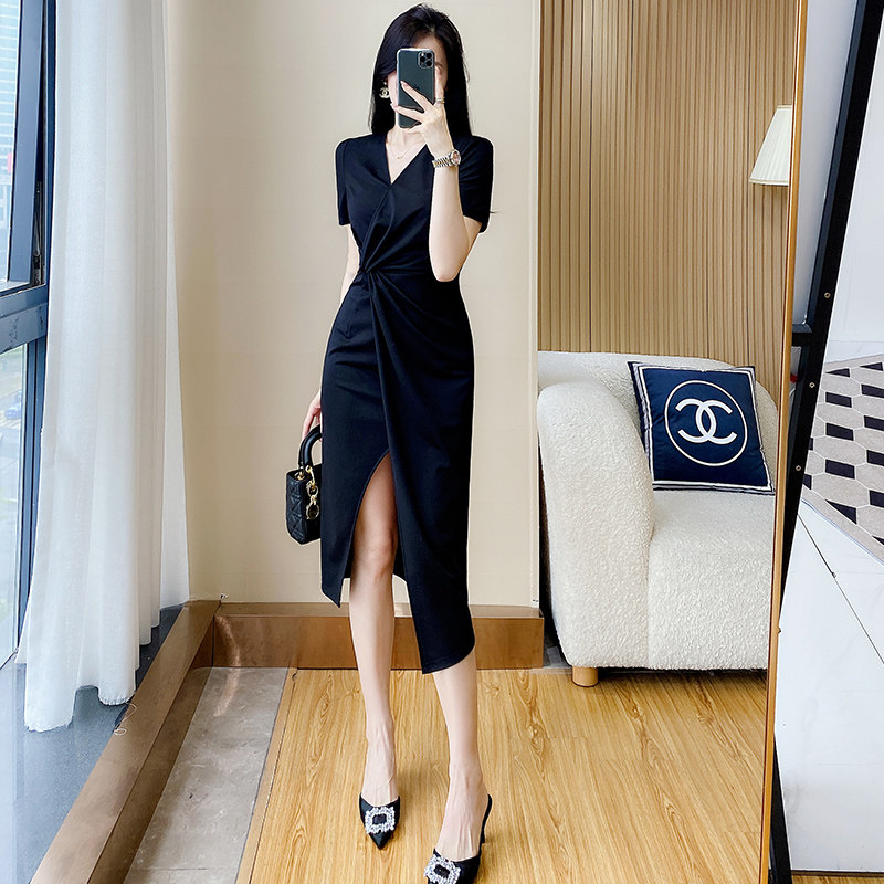 轻熟风黑色扭结连衣裙女设计感小众高冷御姐名媛遮肚显瘦开叉裙子