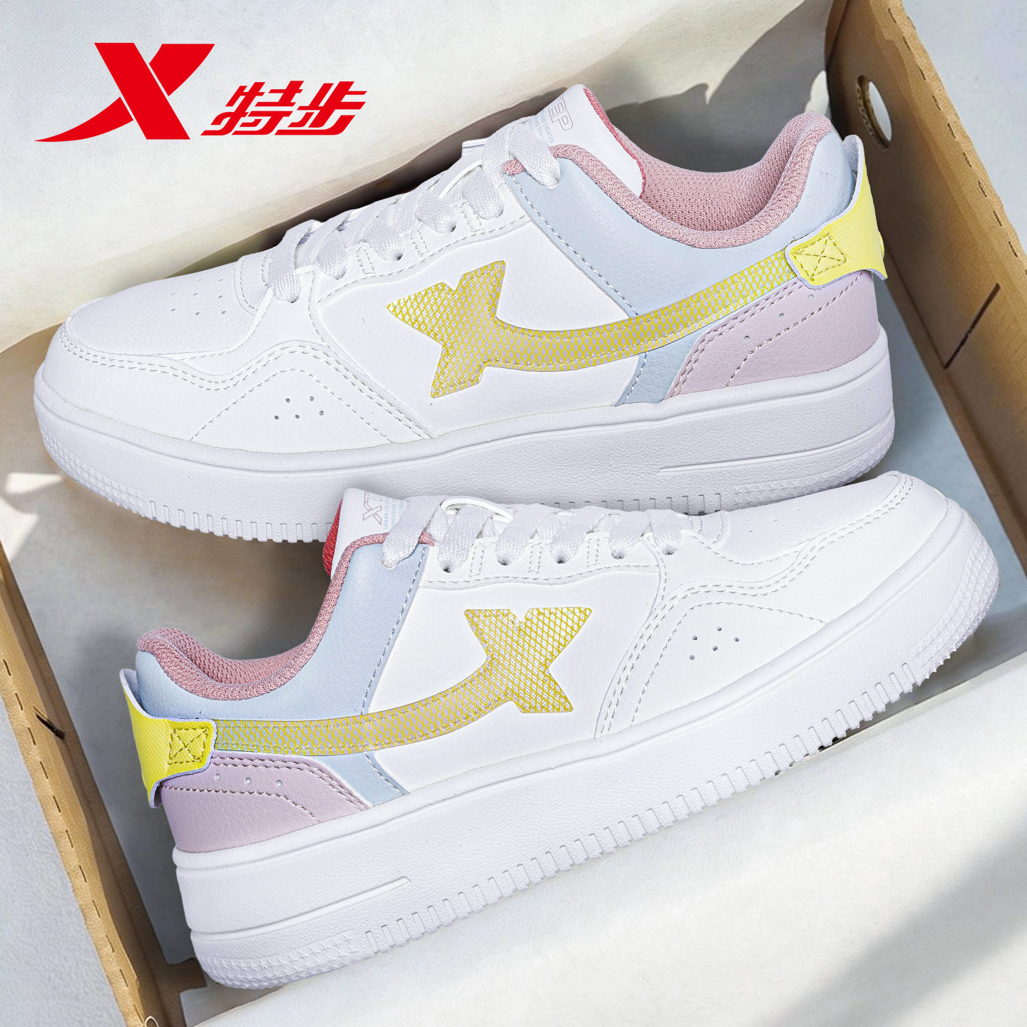 特步女鞋板鞋2026新款春季皮面防水小白鞋女款学生休闲鞋子运动鞋