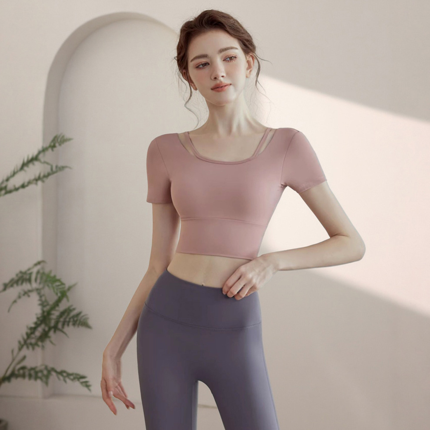 高级感瑜伽服套装带胸垫运动短袖显瘦性感普拉提跑步速干健身上衣