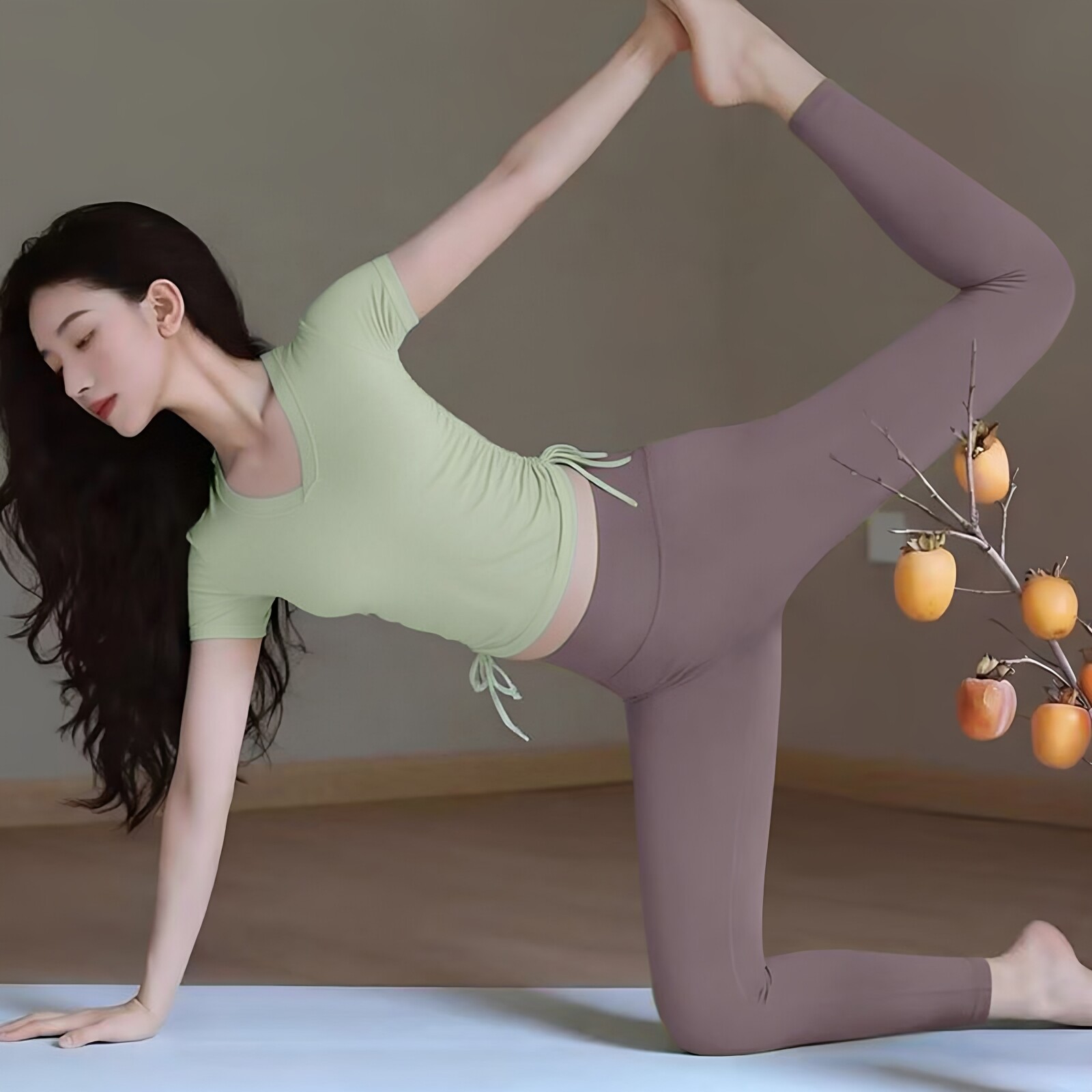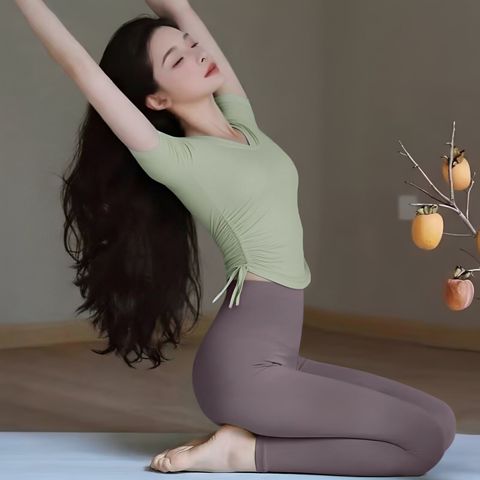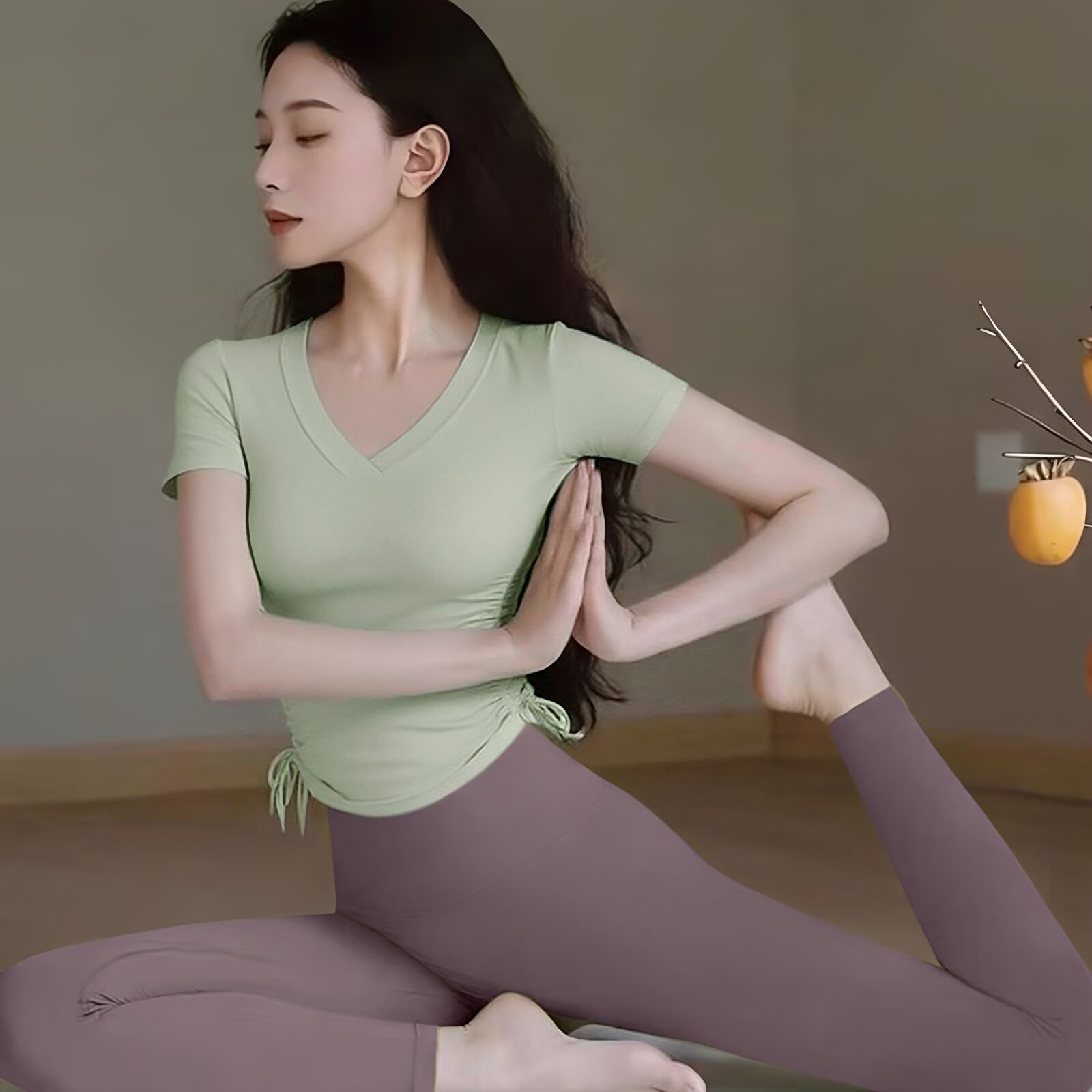 短袖瑜伽服女褶皱收腰修身显瘦夏季速干薄款普拉提V领健身衣套装