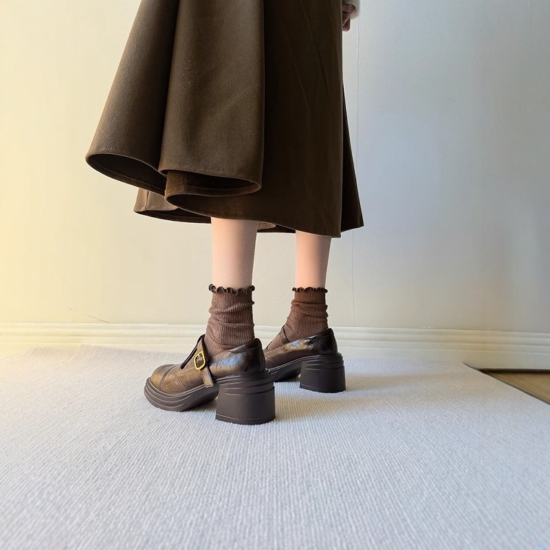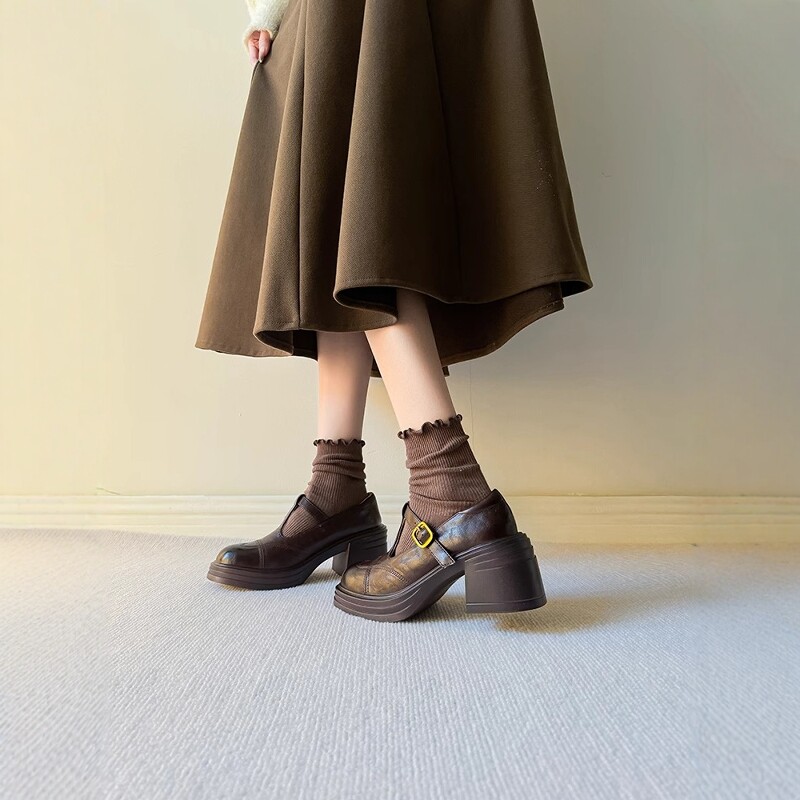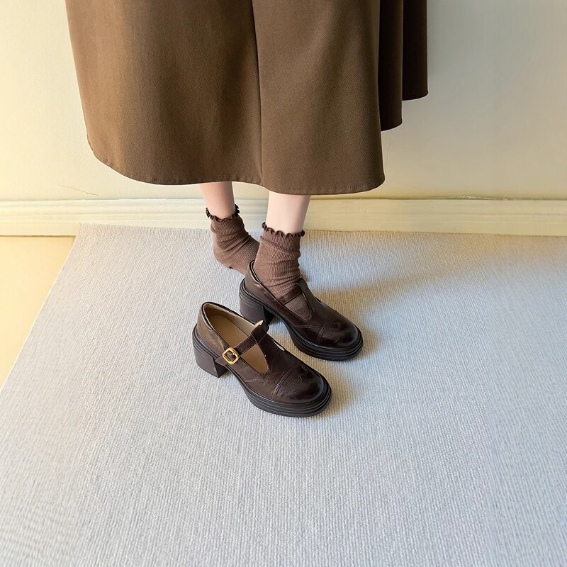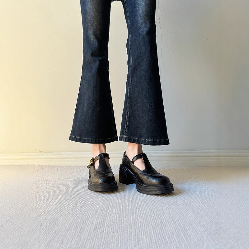 10cm内增高牛皮版英伦T字带小皮鞋小个子单鞋女真皮粗跟玛丽珍鞋