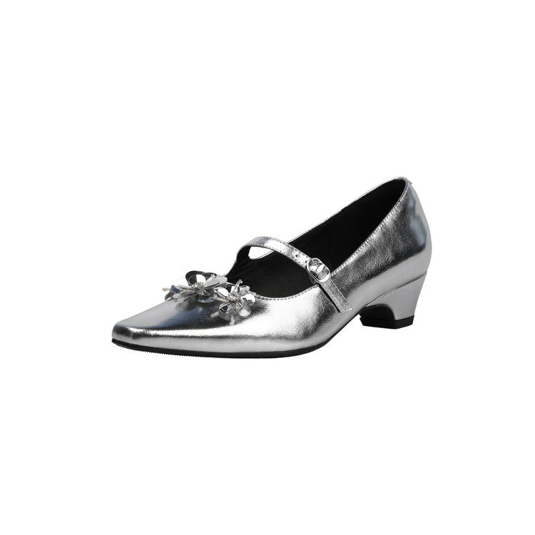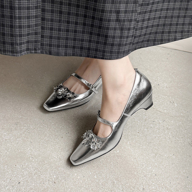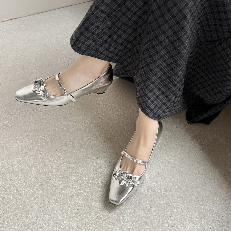 4cm早春漂亮单鞋女2026真皮法式方头浅口内增高花朵银色玛丽珍鞋