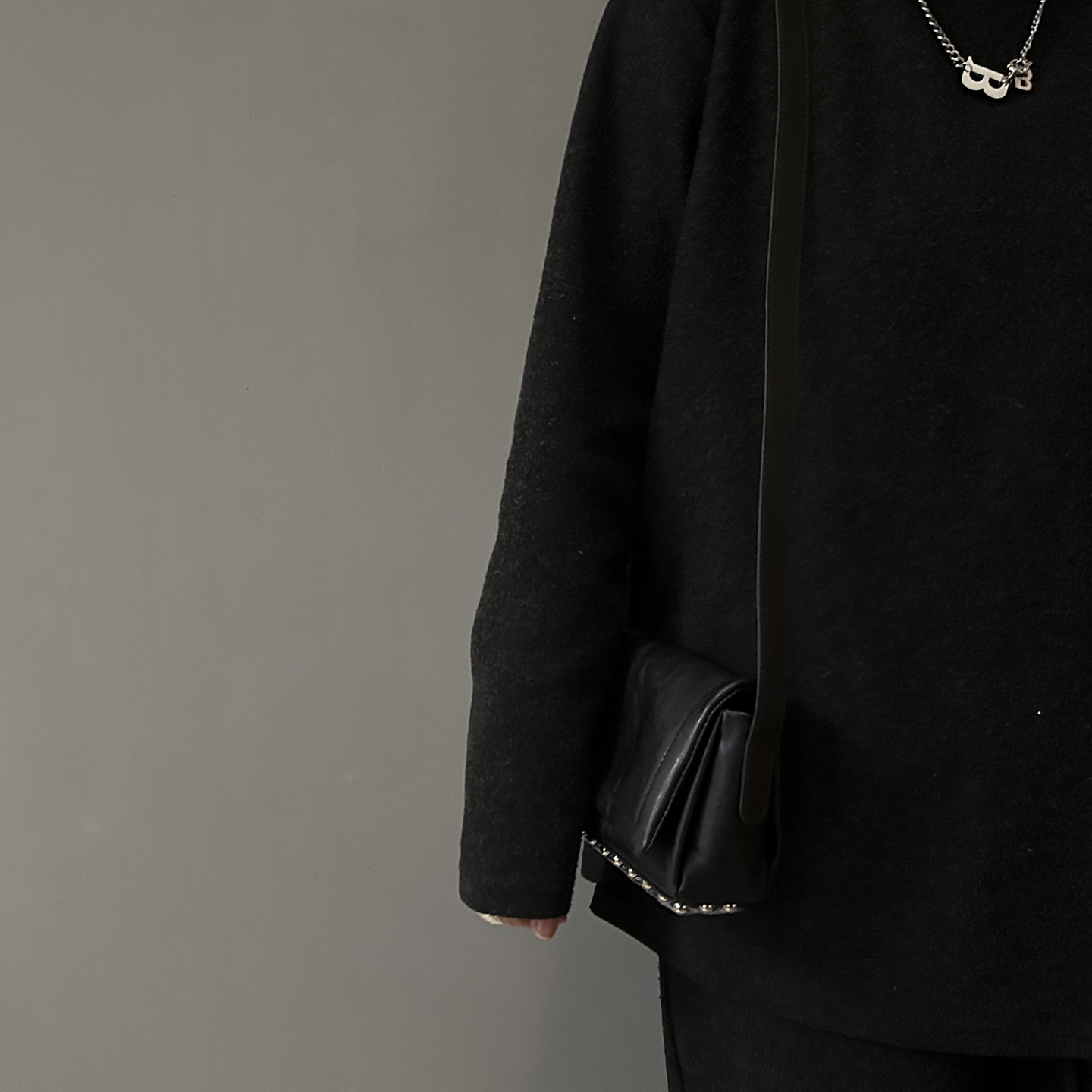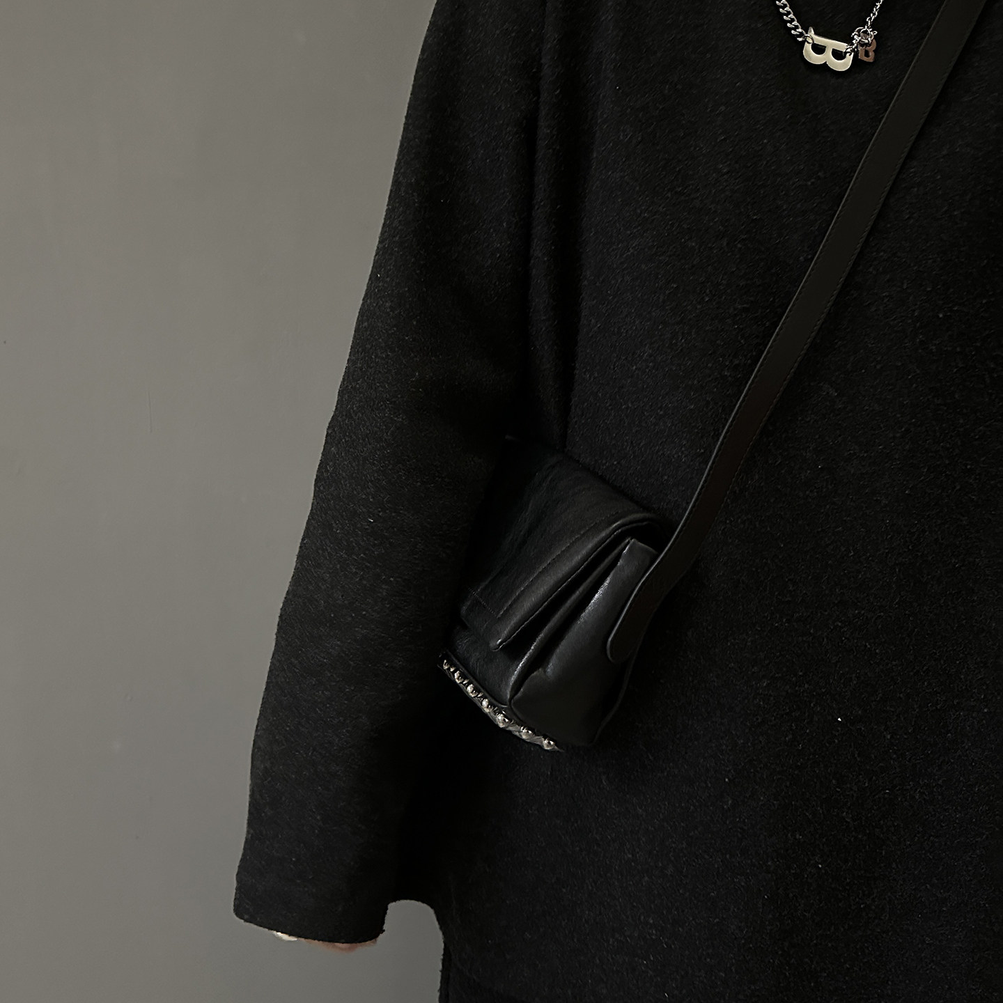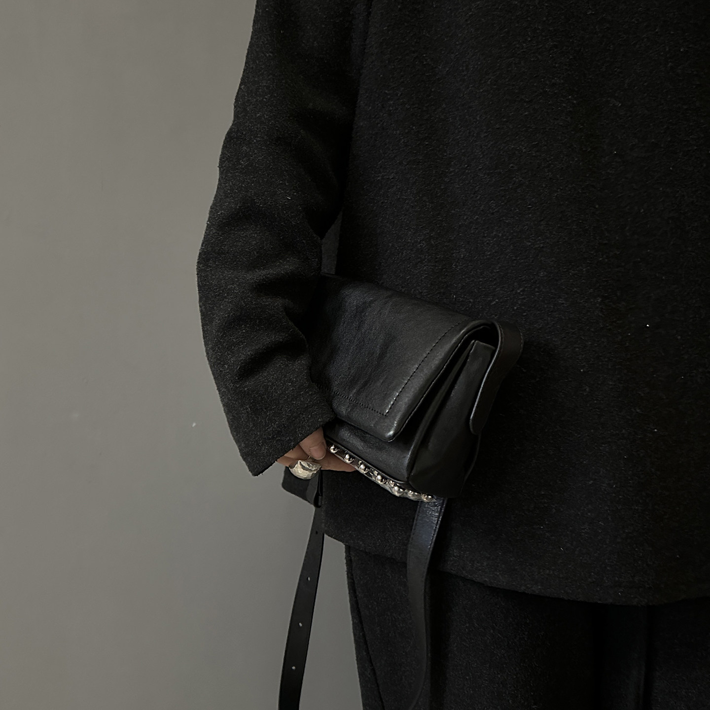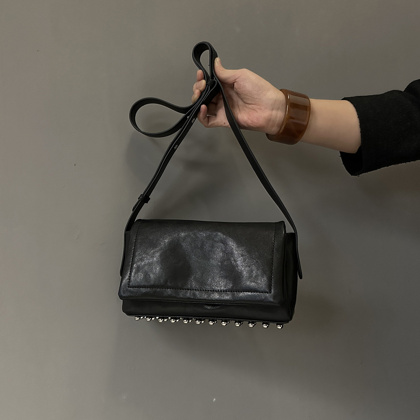 水晶植鞣头层牛皮全真皮女士小包新款底部铆钉黑色机车包斜挎包潮