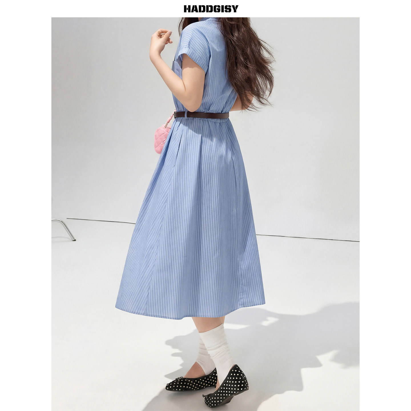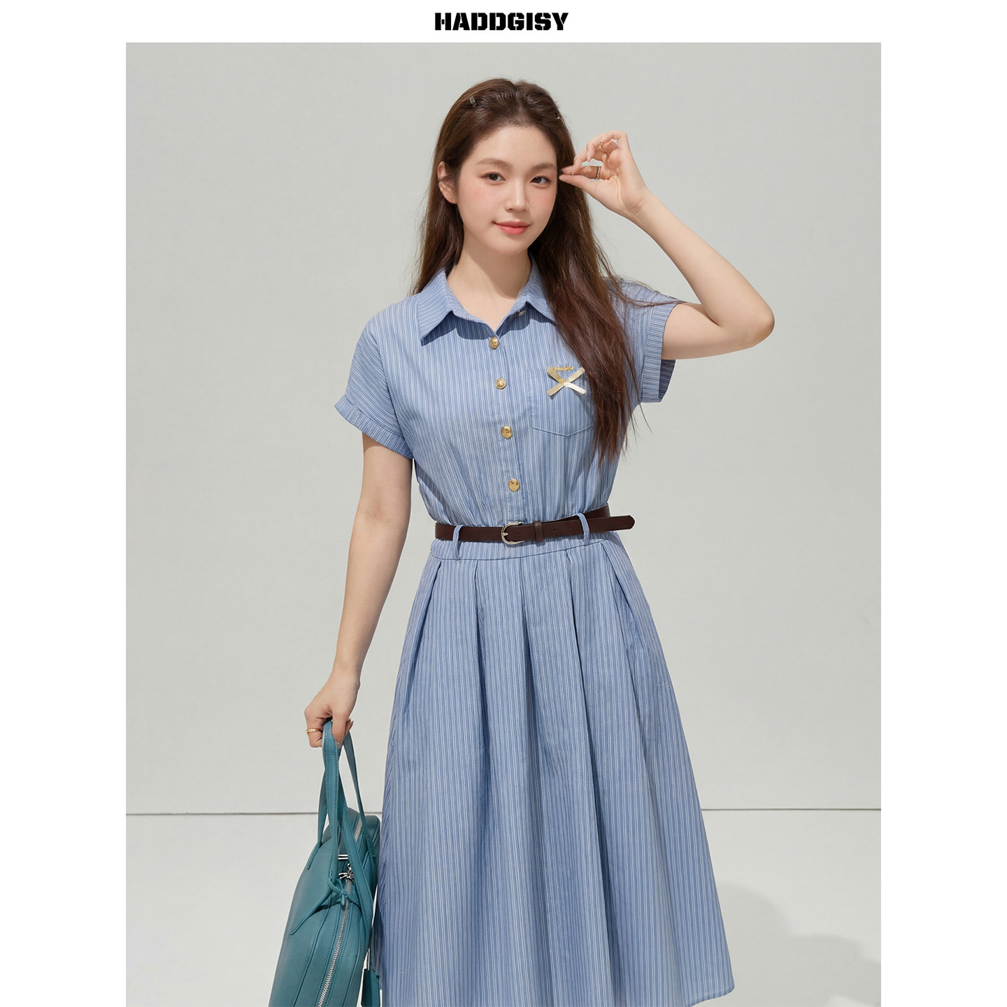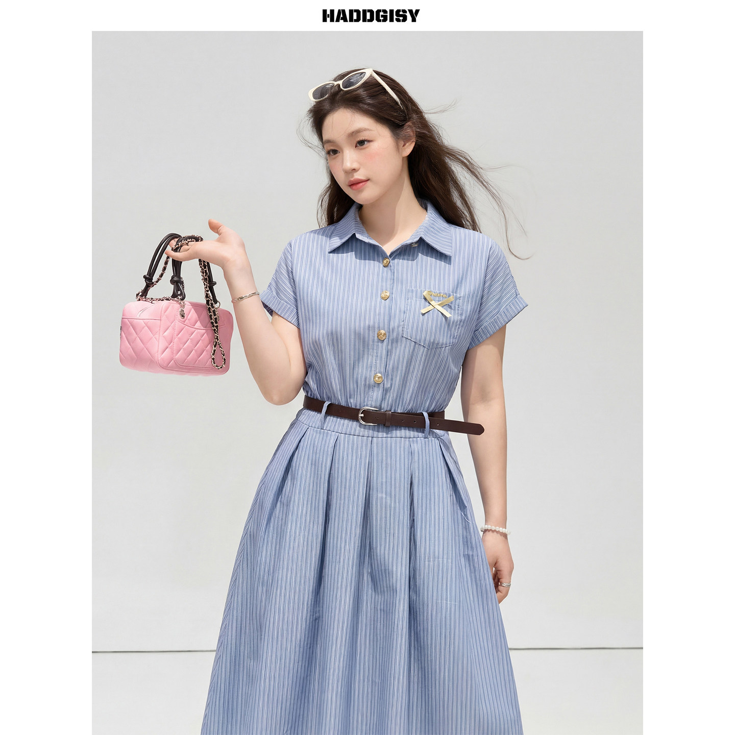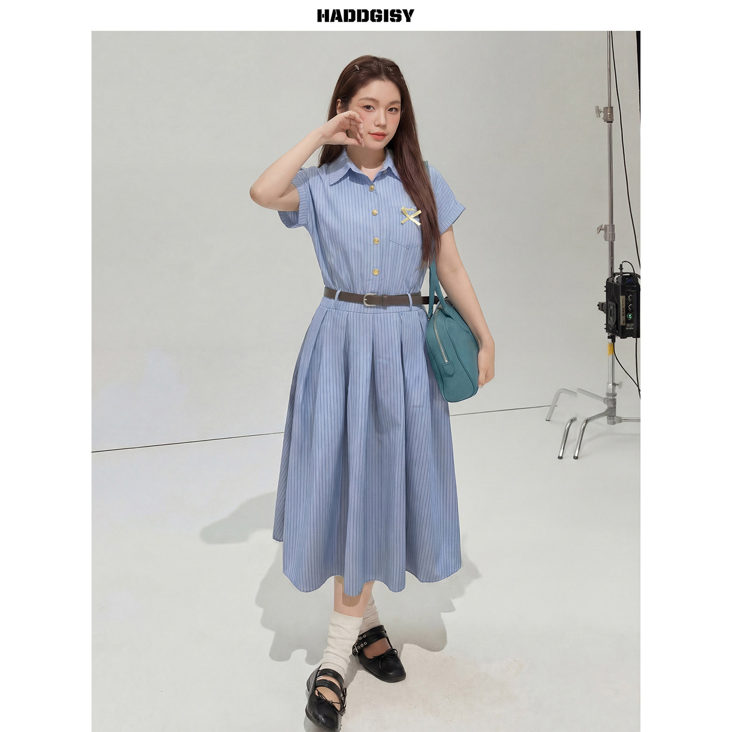 曾小咸大码女装胖mm蓝色条纹连衣裙女夏季巨好看裙子收腰显瘦长裙