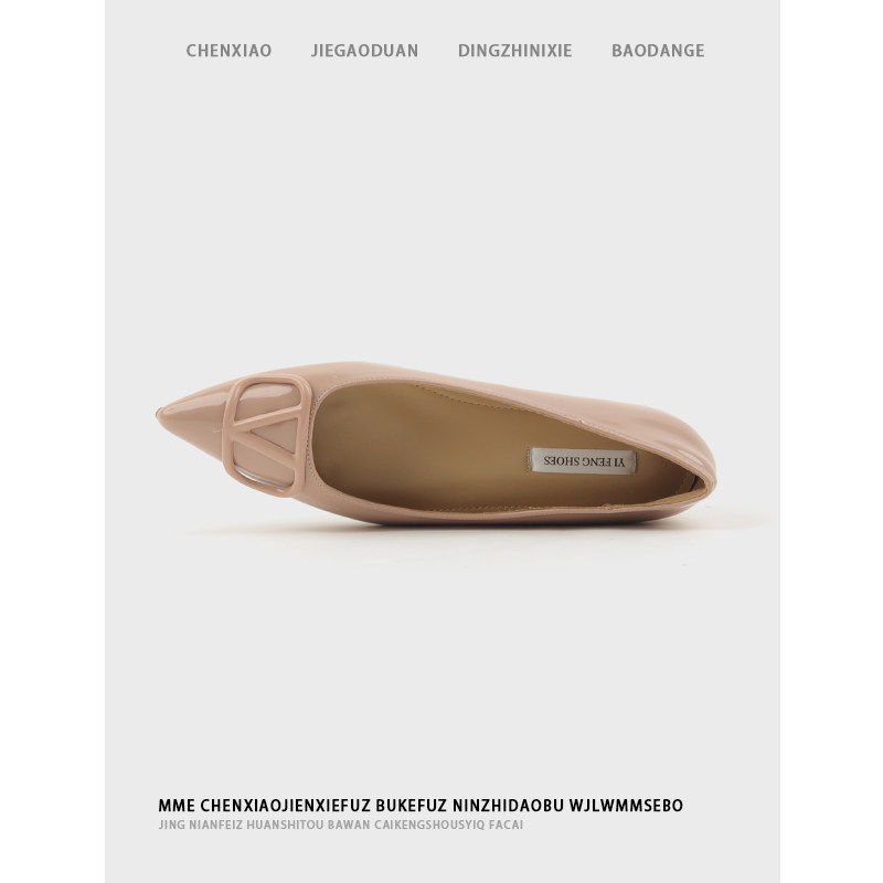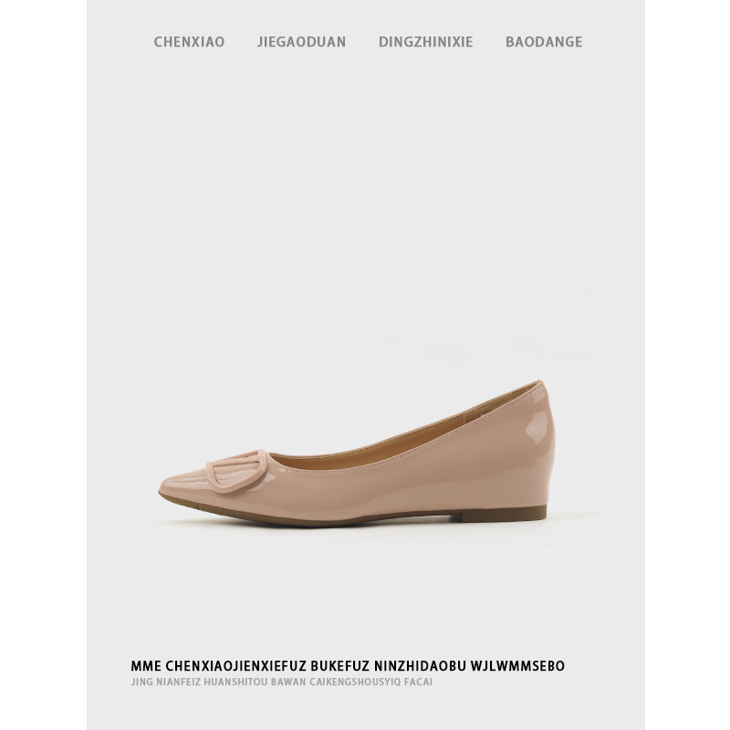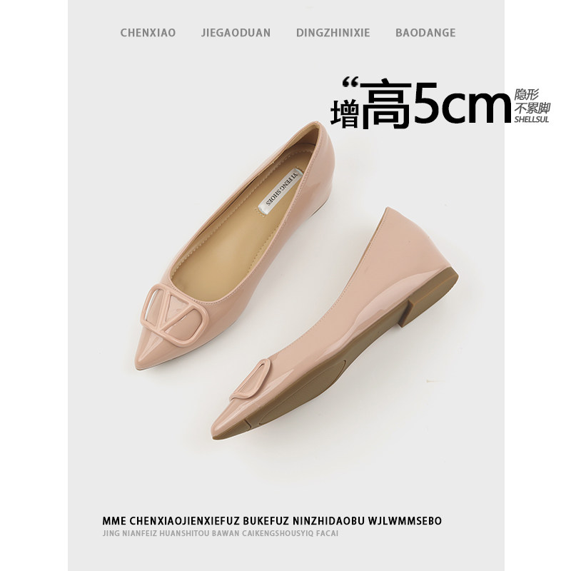 裸色V扣尖头软底单鞋女漆皮法式温柔晚风隐形内增高平底浅口女鞋
