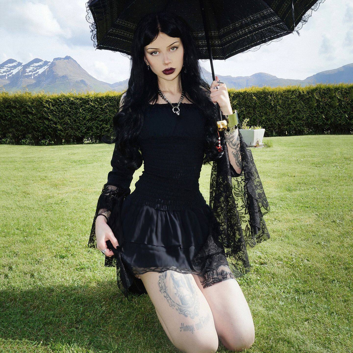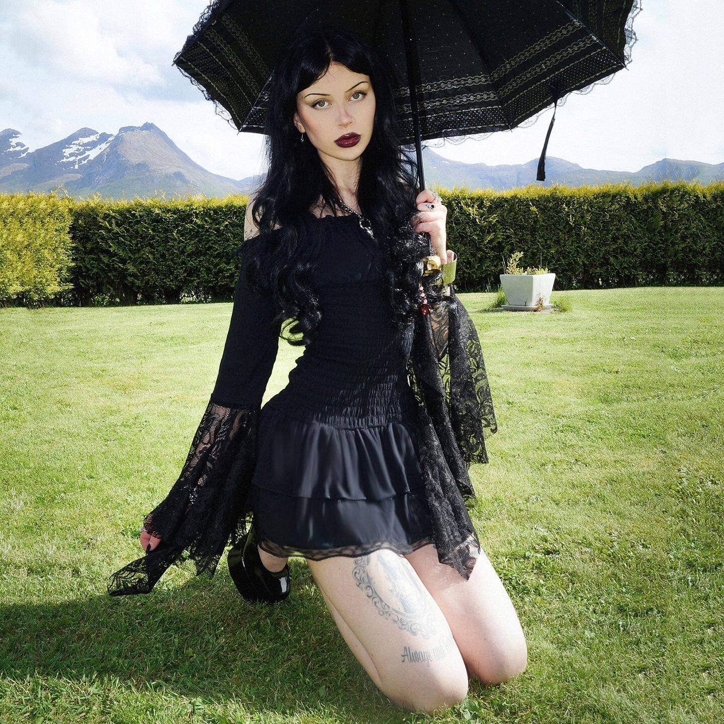 跨境暗黑哥特风露肩蕾丝喇叭袖连衣裙打揽弹力收腰蓬蓬蛋糕裙短款