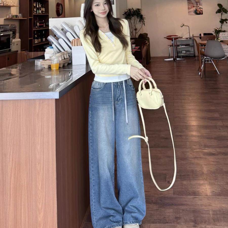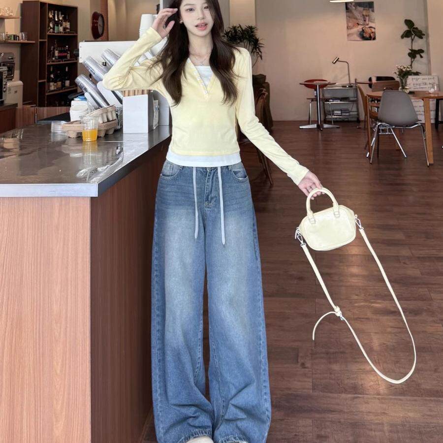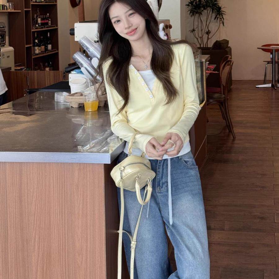 嫩黄色假两件长袖t恤女早春季2026爆款新款修身独特别致短款上衣