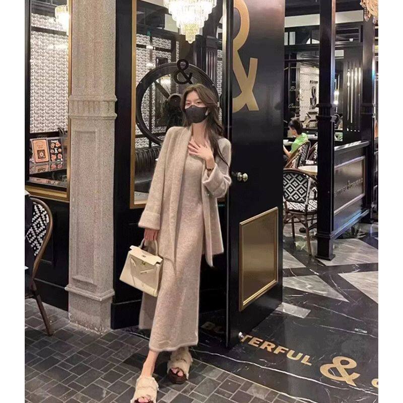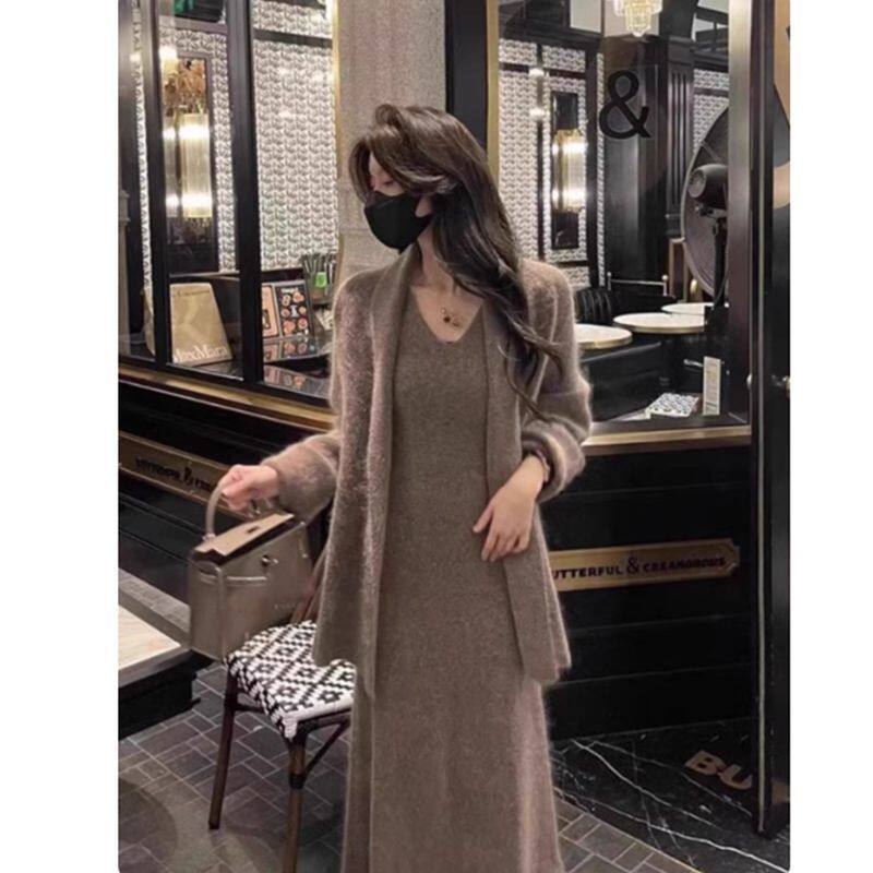 秋冬温柔茶系毛衣连衣裙套装慵懒宽松中长款针织开衫吊带裙两件套