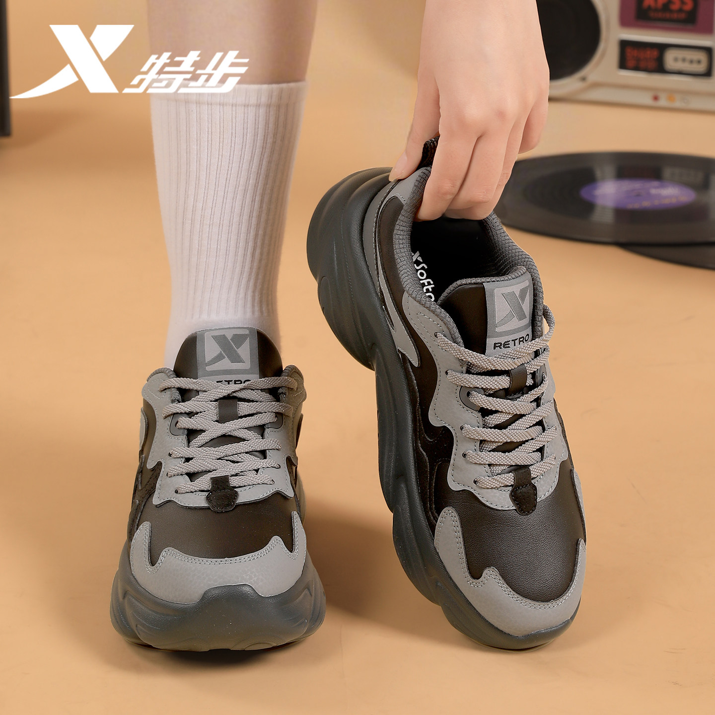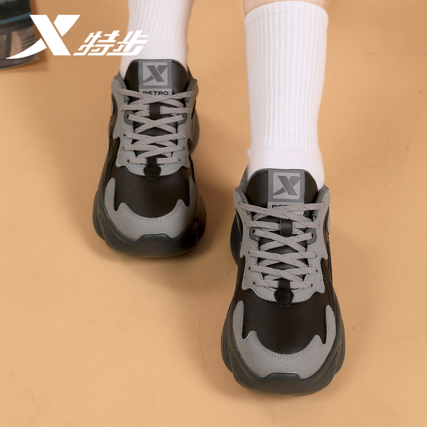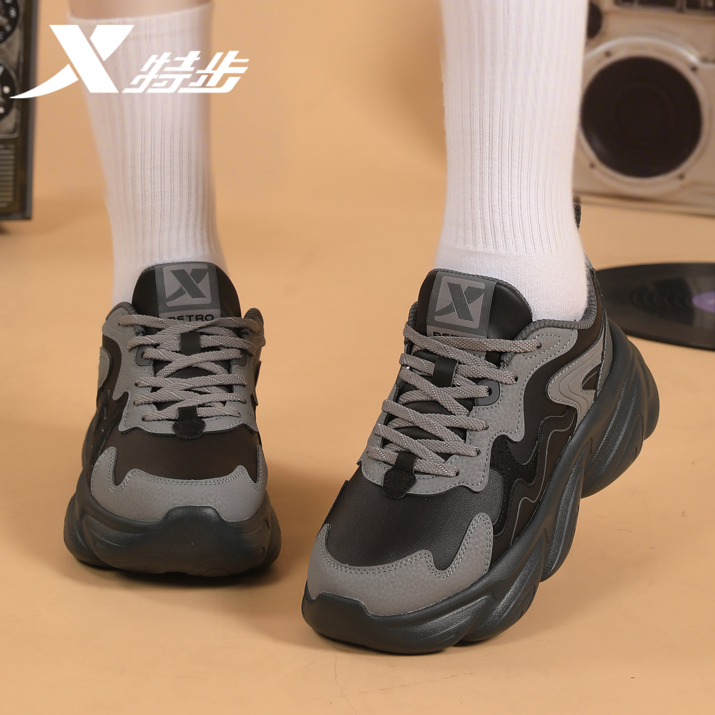 特步女鞋2026春季新款皮面防水老爹鞋潮流休闲黑色厚底运动鞋女款