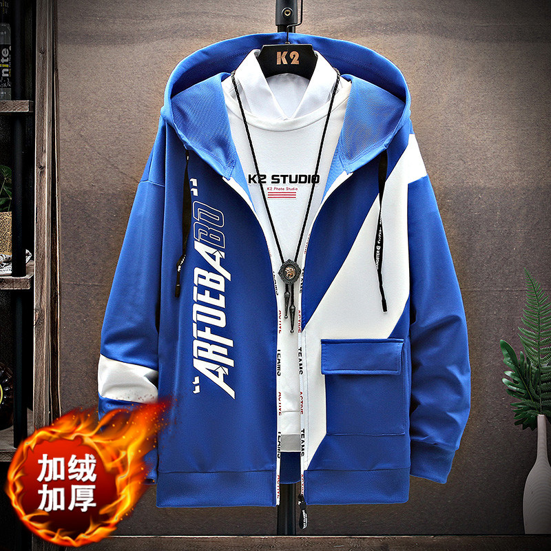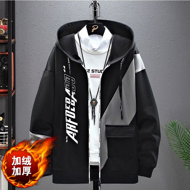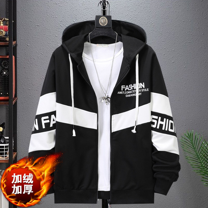加绒连帽开衫卫衣青少年男生休闲潮流运动保暖外套男秋冬款加厚款