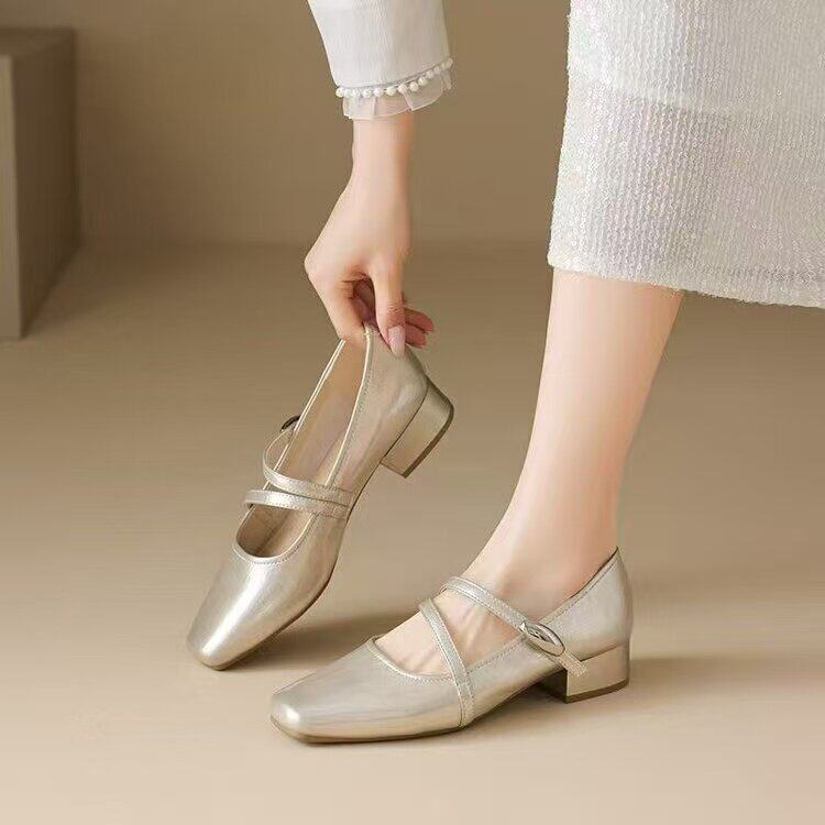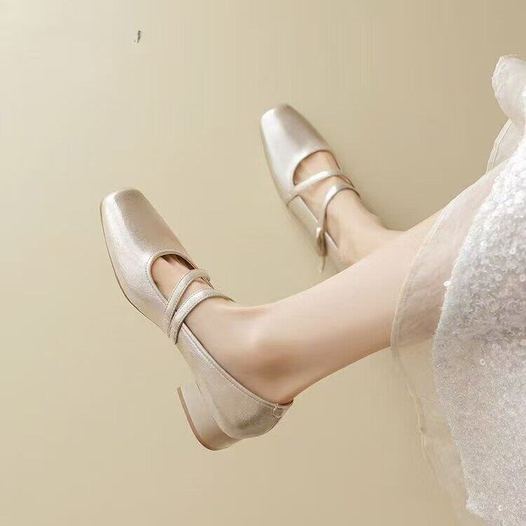 品牌真皮银色玛丽珍鞋女2026新款春夏粗跟绝美方头配裙子浅口单鞋