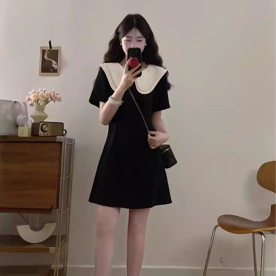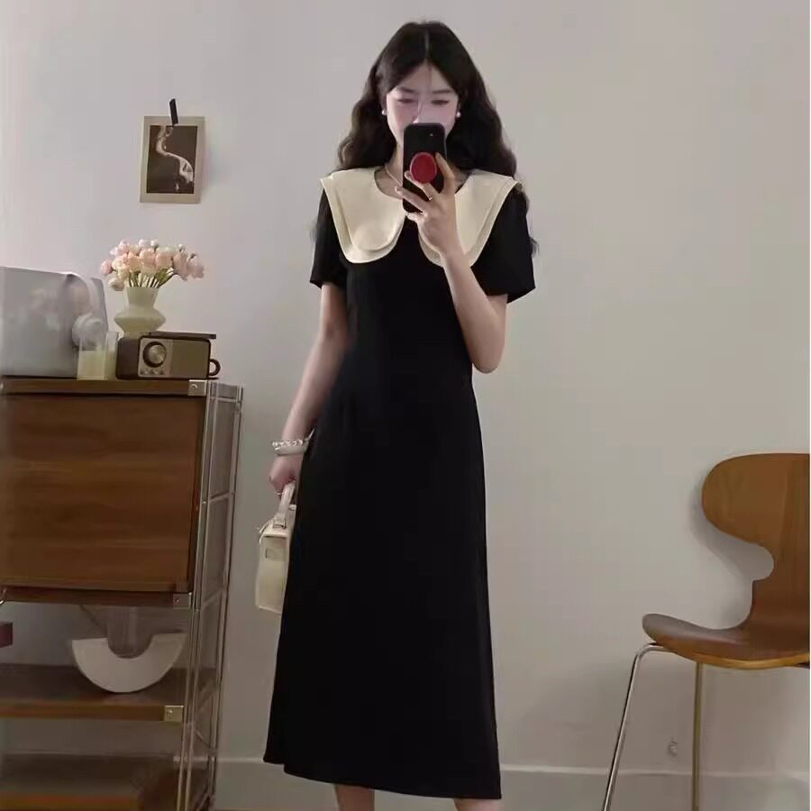大码胖mm法式气质收腰娃娃领连衣裙女夏季撞色拼接别致小黑裙长裙