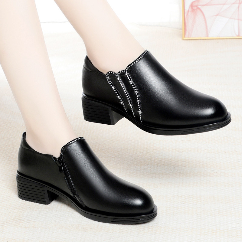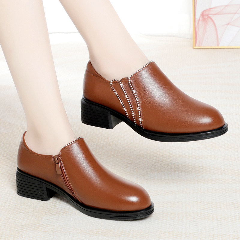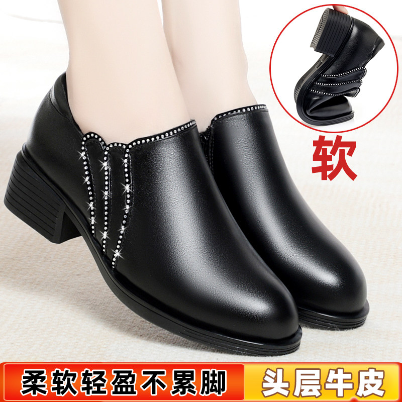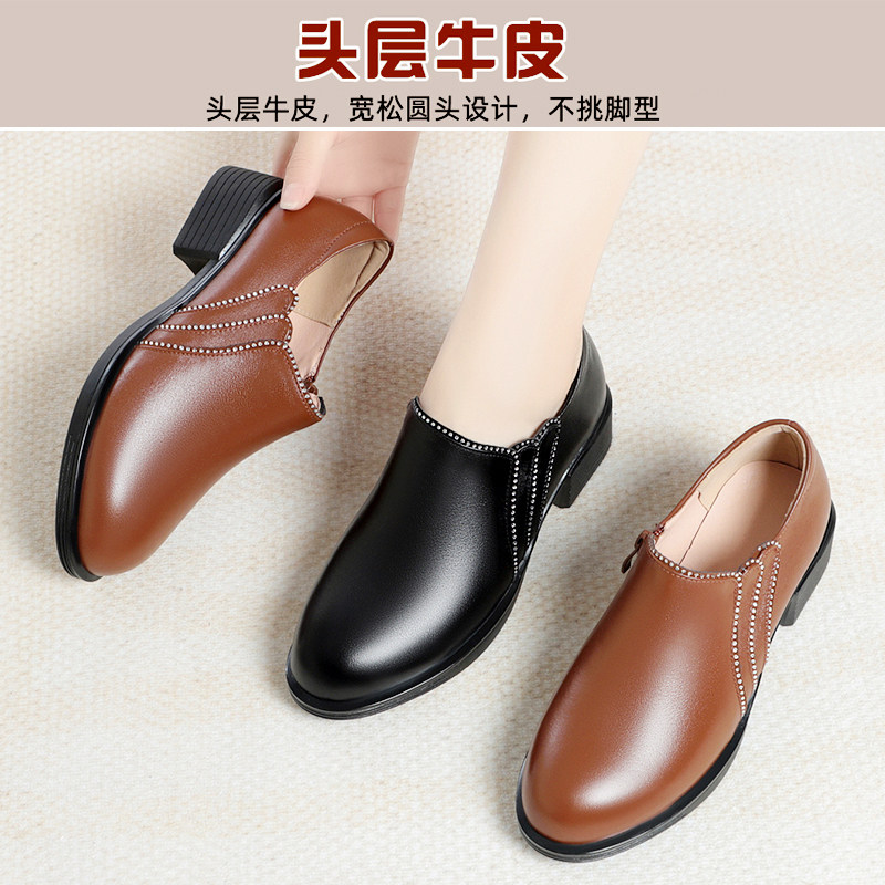 中年女士皮鞋真皮中跟不累脚女鞋头层牛皮妈妈鞋软底轻便软皮单鞋