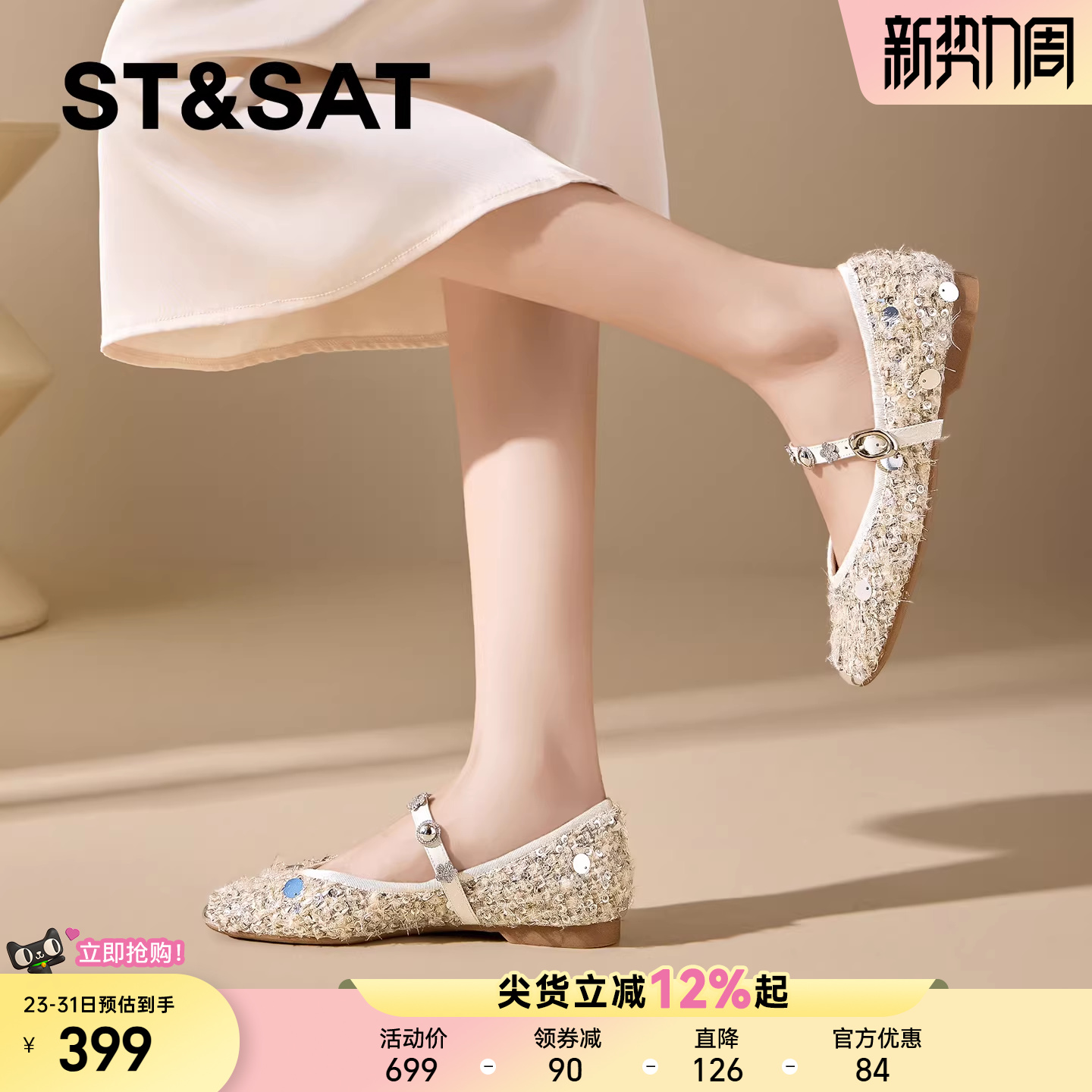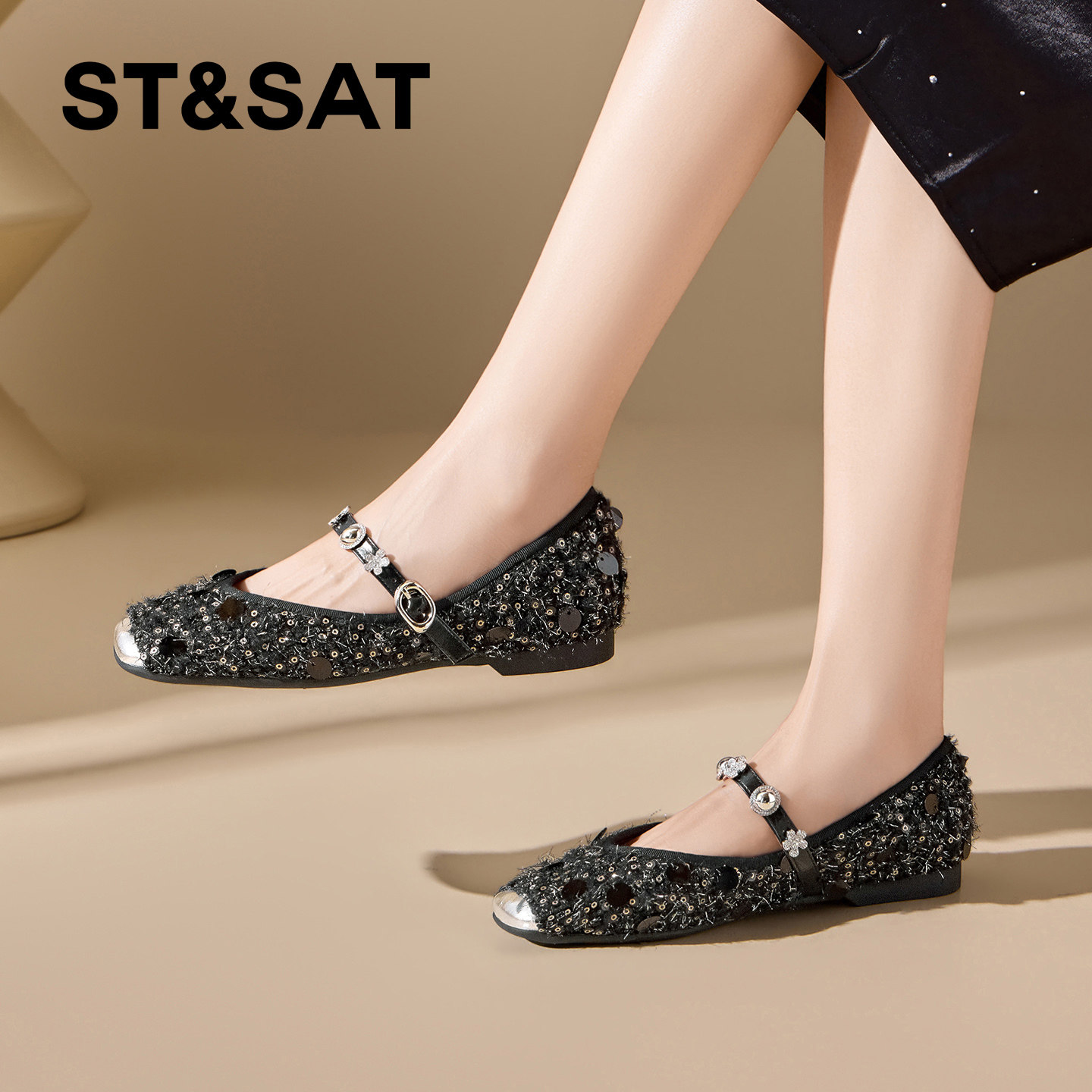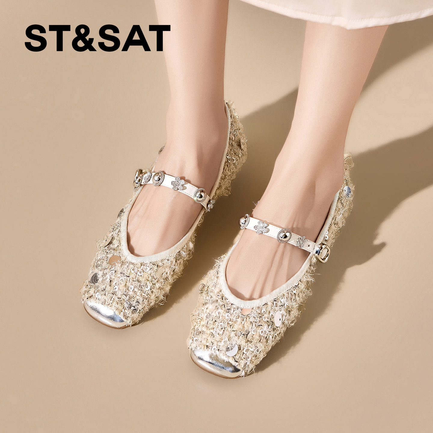 星期六精致亮片方头平底内增高玛丽珍鞋女2026春季新款一字带单鞋
