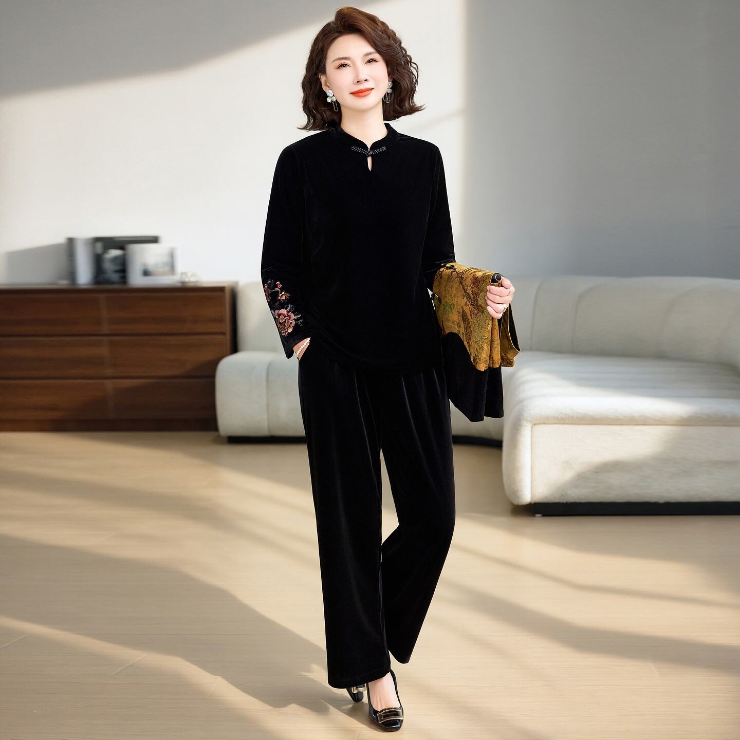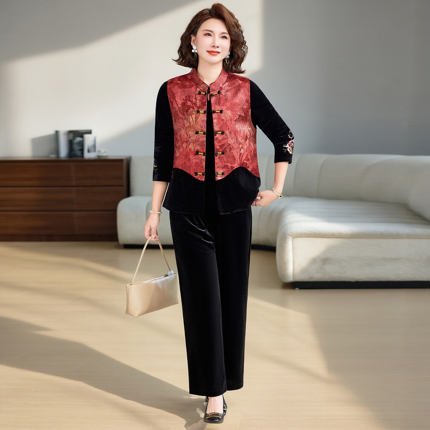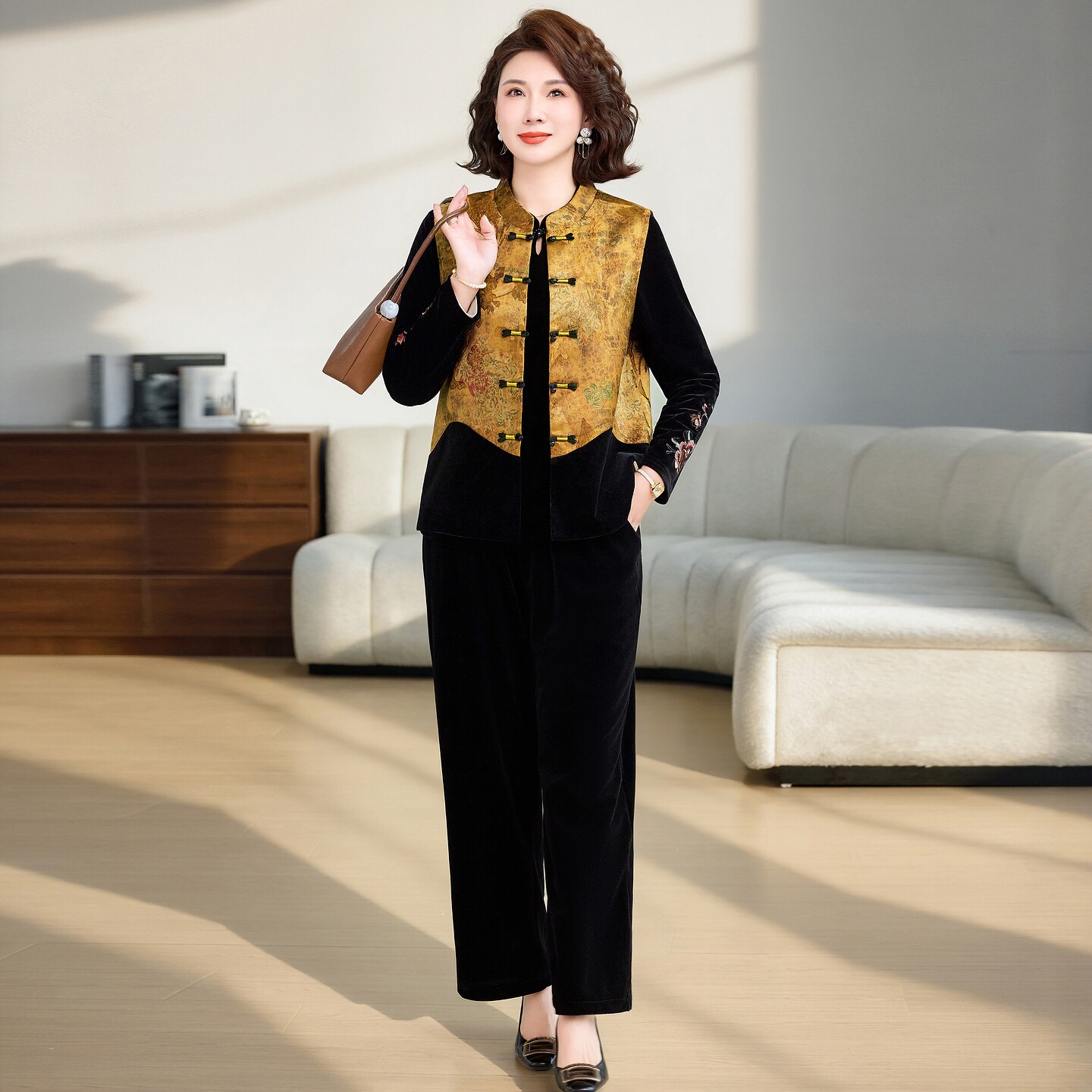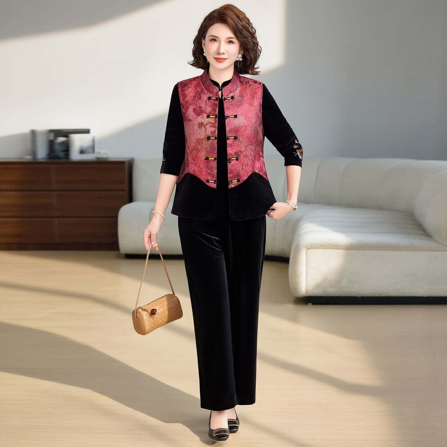 新中式风妈妈春装立领盘扣马甲三件套中老年女装洋气高贵气质套装