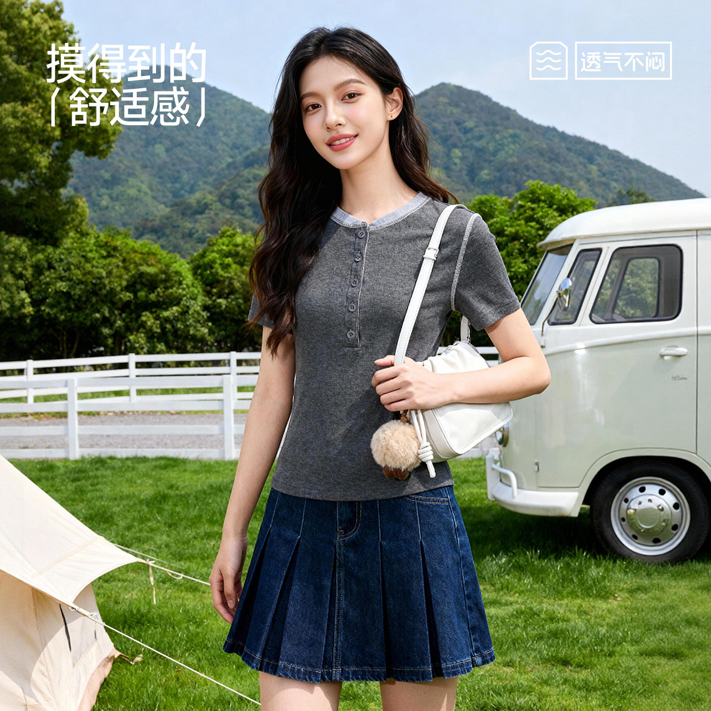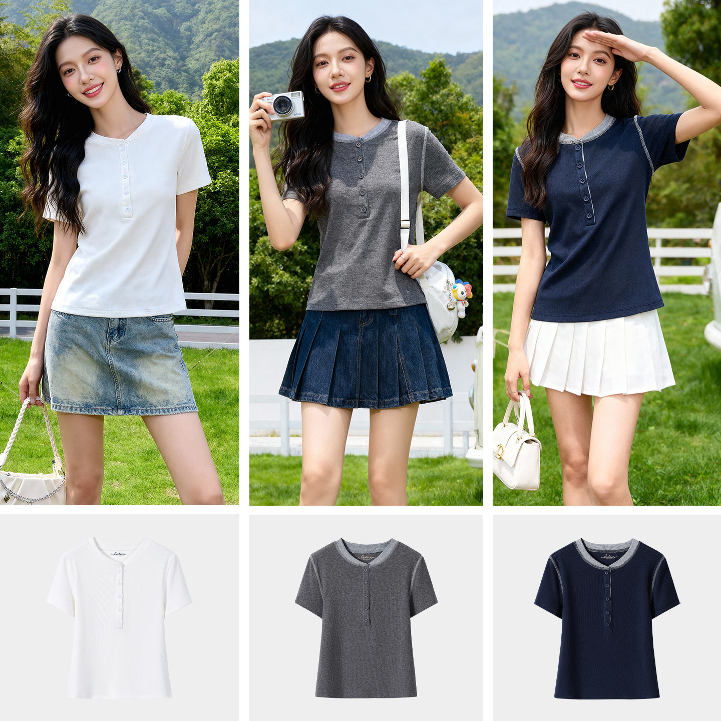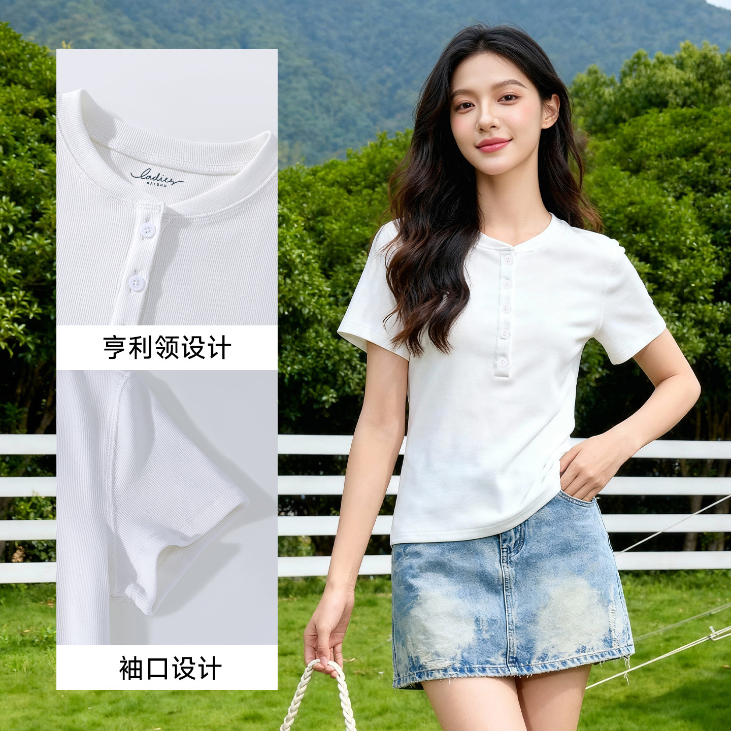 班尼路白色亨利领短袖t恤女款2026夏季新款设计感正肩修身小上衣H