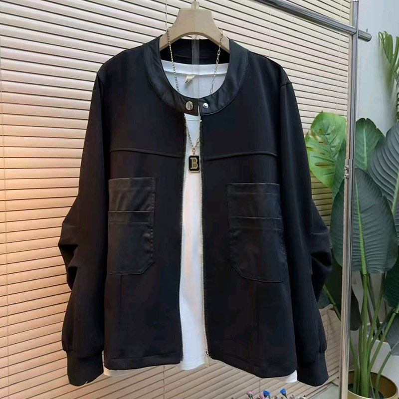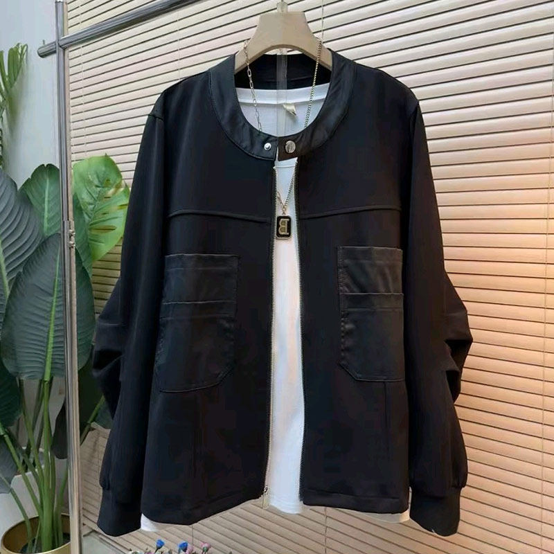 大码女装按扣领压褶长袖外套胖妹妹2026早春新款百搭黑色开衫上衣