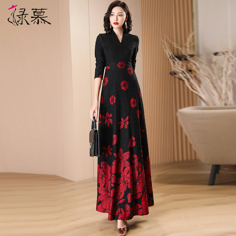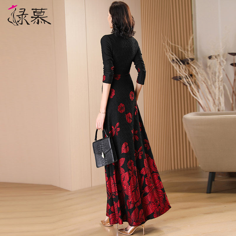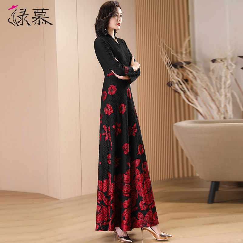 时尚黑色提花长袖连衣裙女长款2023春秋季收腰气质显瘦到脚踝长裙