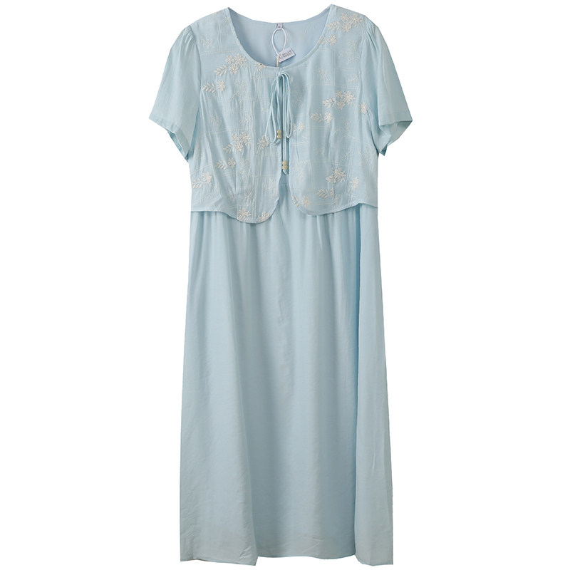 温柔茶歇显瘦绝美小裙子胖莹莹大码女装胖mm夏季假两件刺绣连衣裙