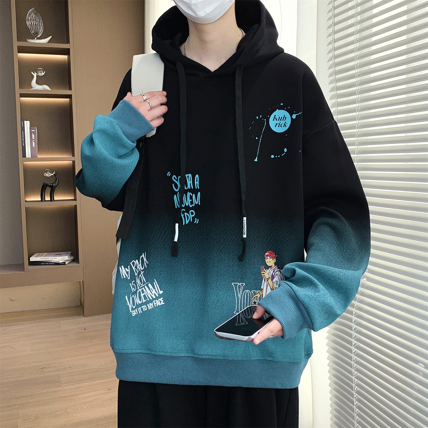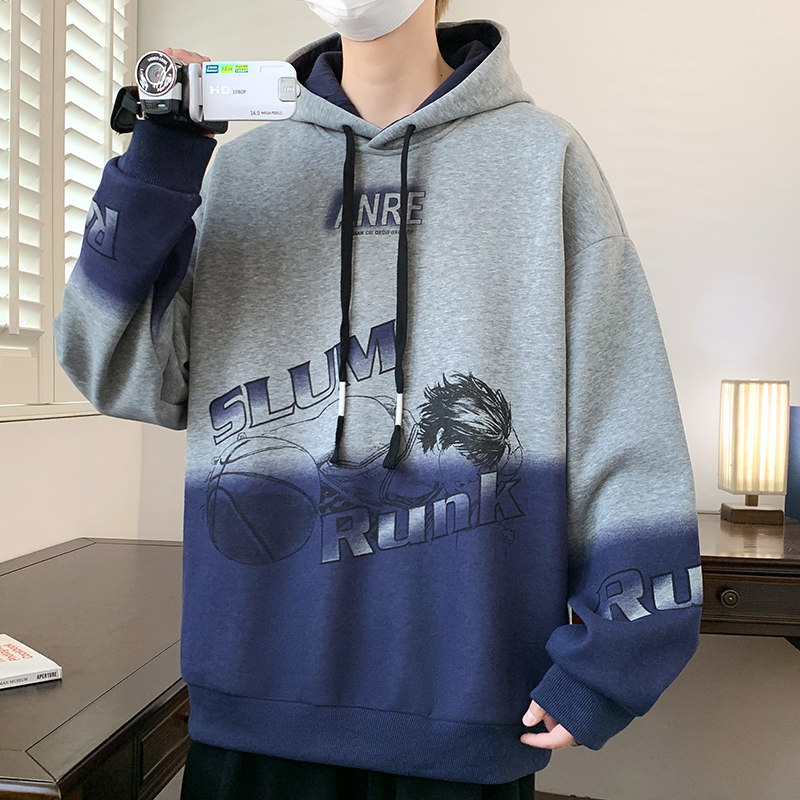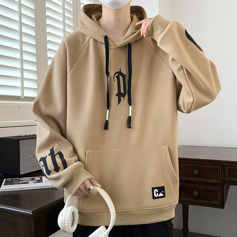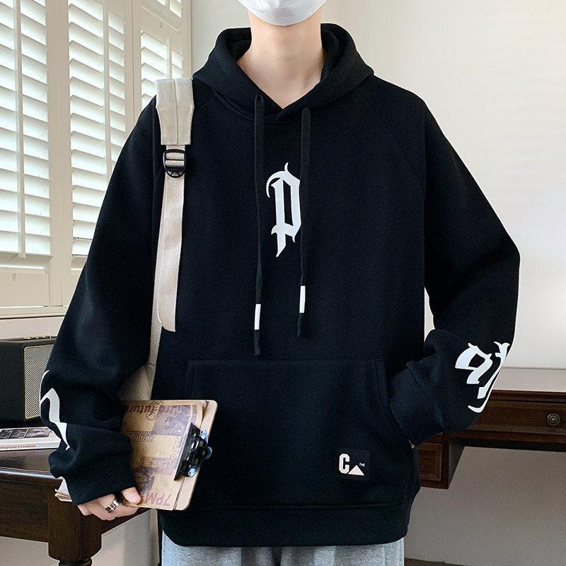 潮流连帽卫衣男青少年学生宽松印花春新款帅气初中生白色套头帽衫