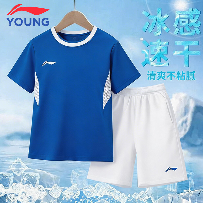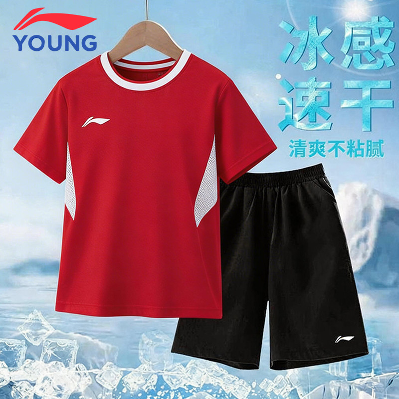 李宁儿童套装2026新款轻薄透气男童女童速干短裤短袖青少年比赛服