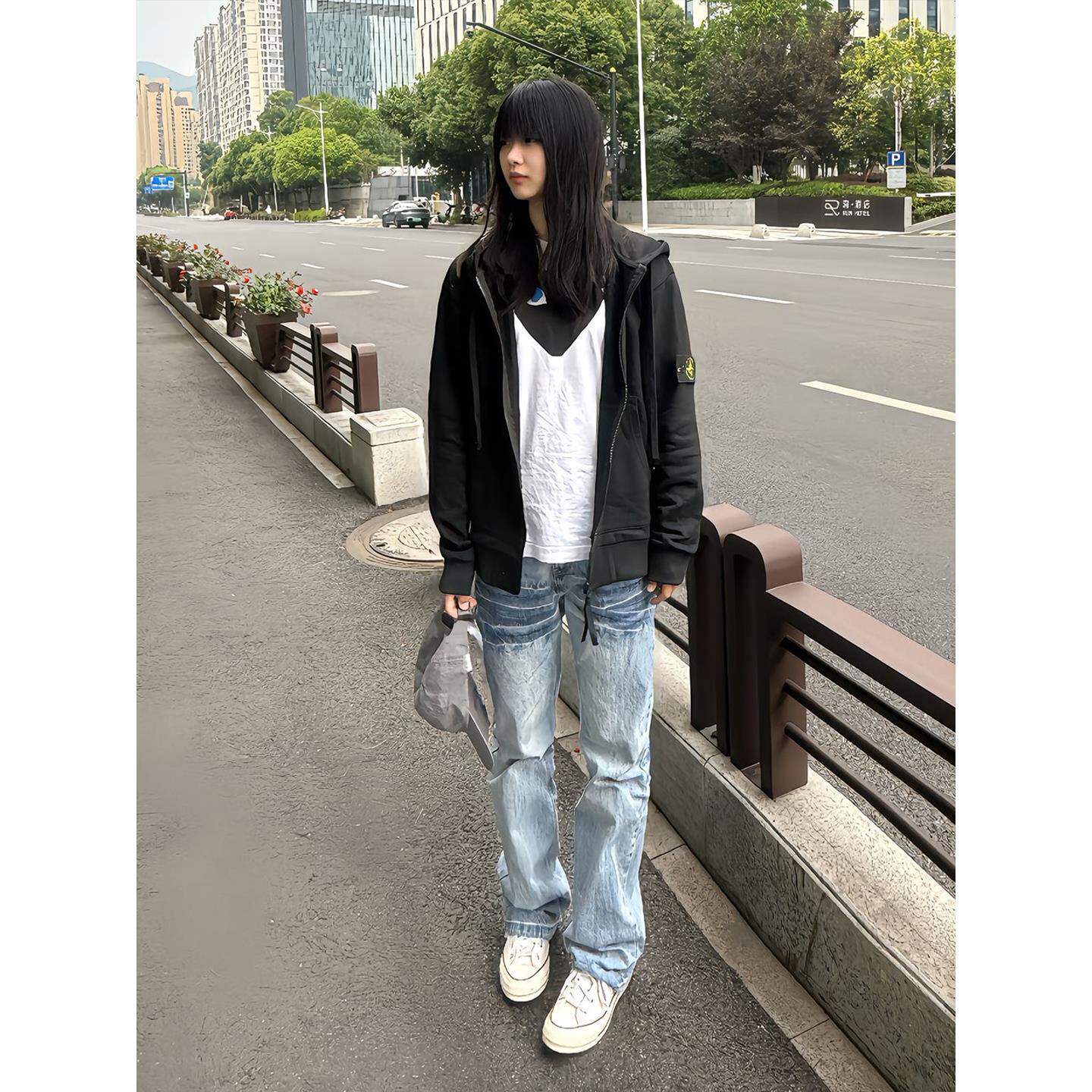 冰蓝色闪电纹微喇牛仔裤男女款夏薄款美式高街情侣裤子窄版直筒裤