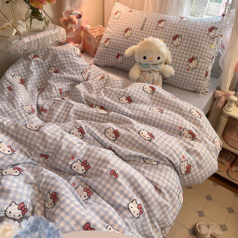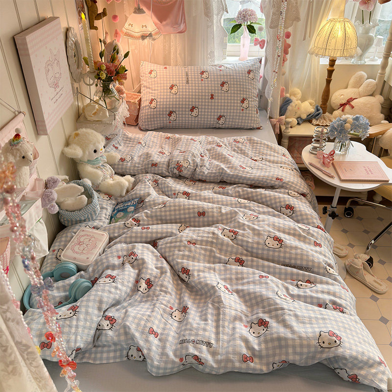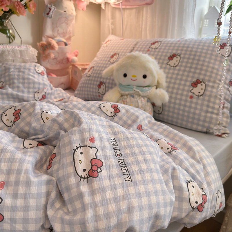 小清新简约蓝格kt猫水洗棉床上四件套被套纯棉全棉2026新款三件套