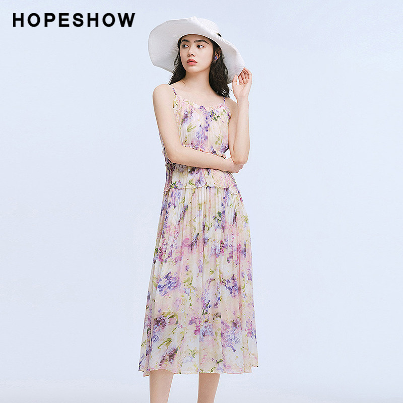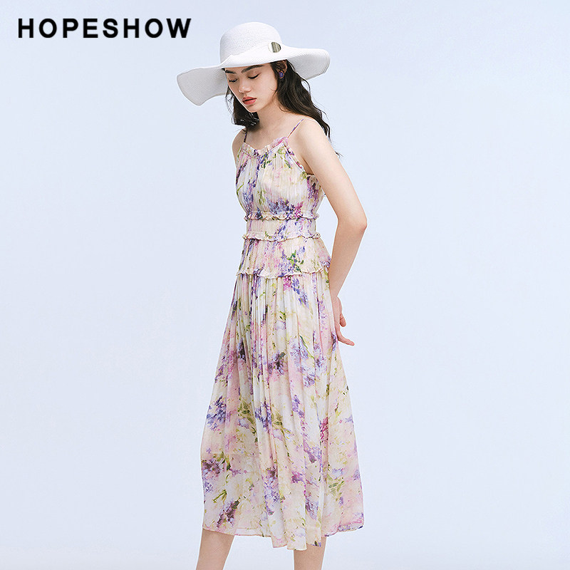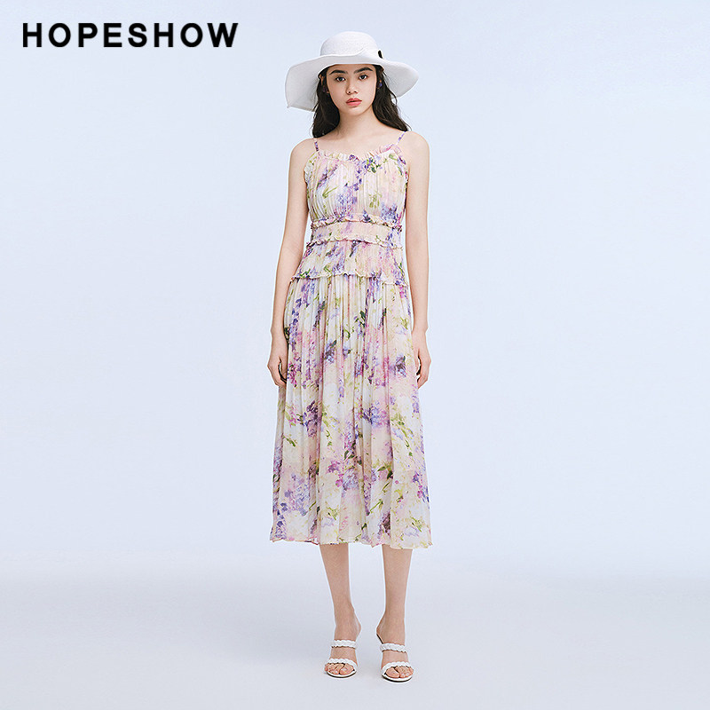 【会员专享】红袖2025夏季新款女装花卉印花木耳边拼接中长吊带裙