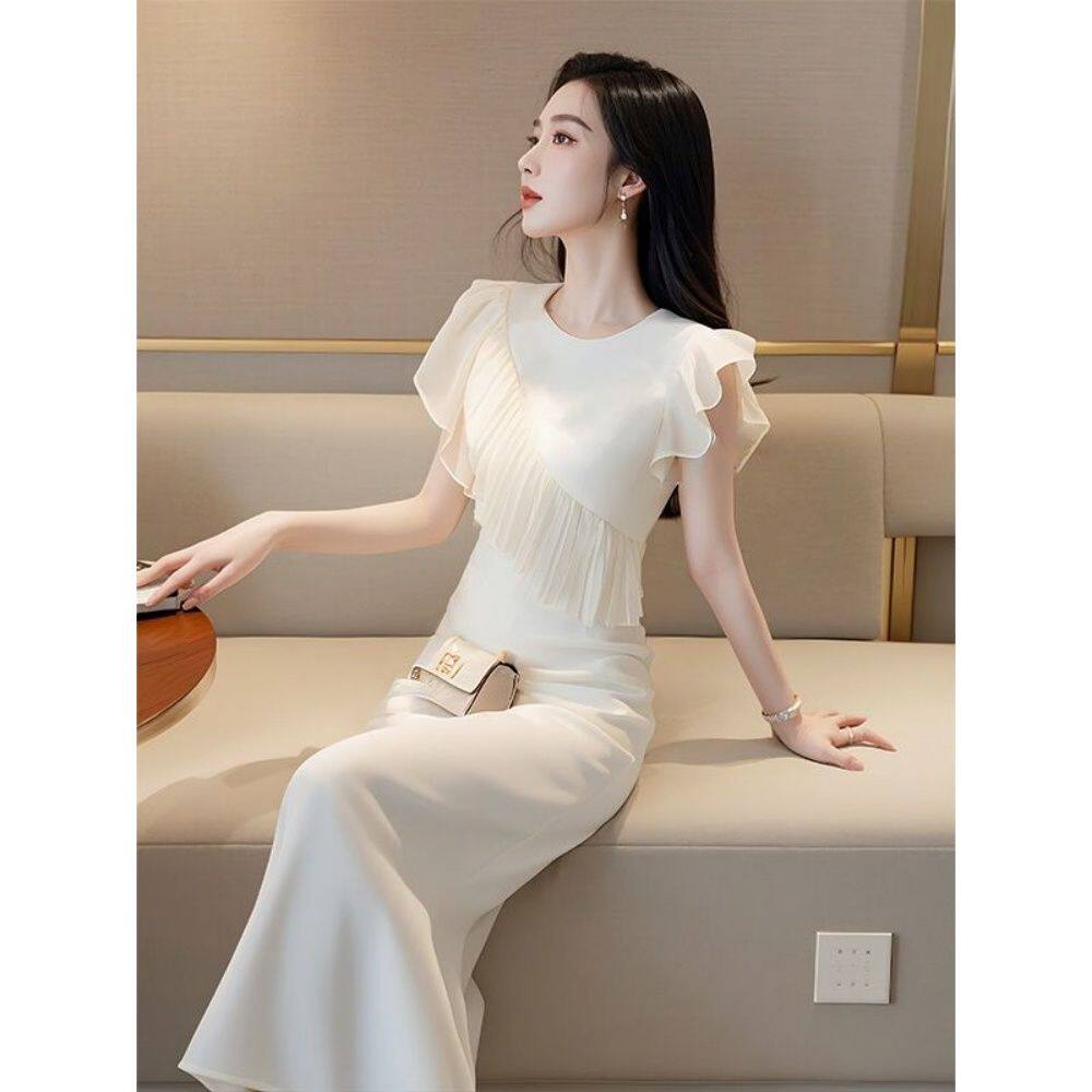 仙气白色连衣裙女夏季短袖荷叶边收腰修身包臀鱼尾长裙气质通勤裙
