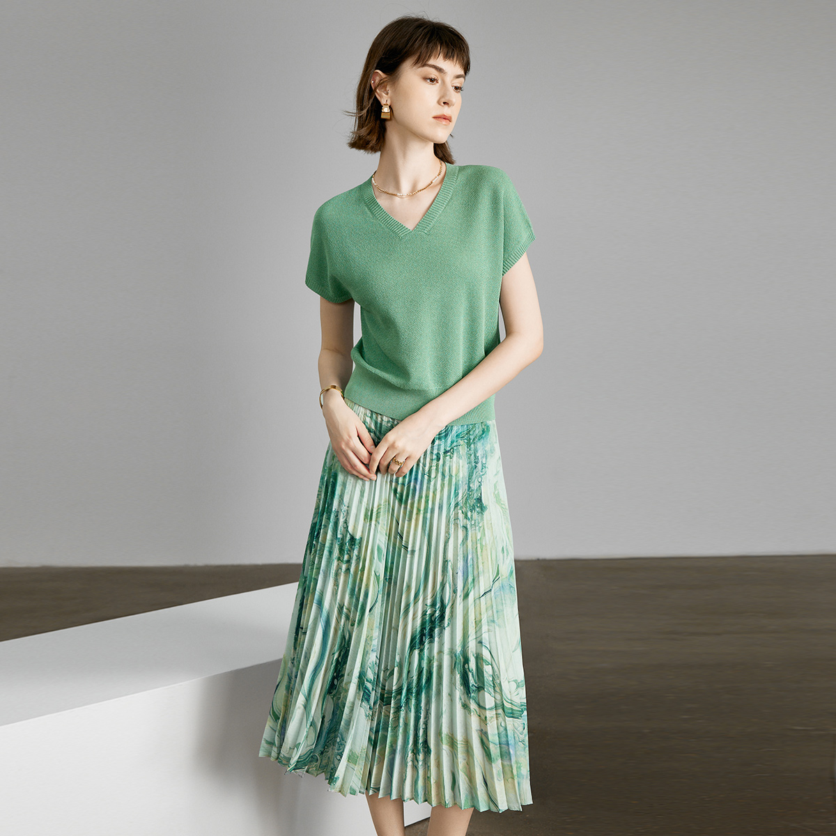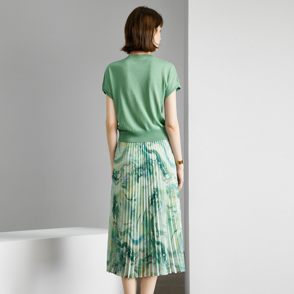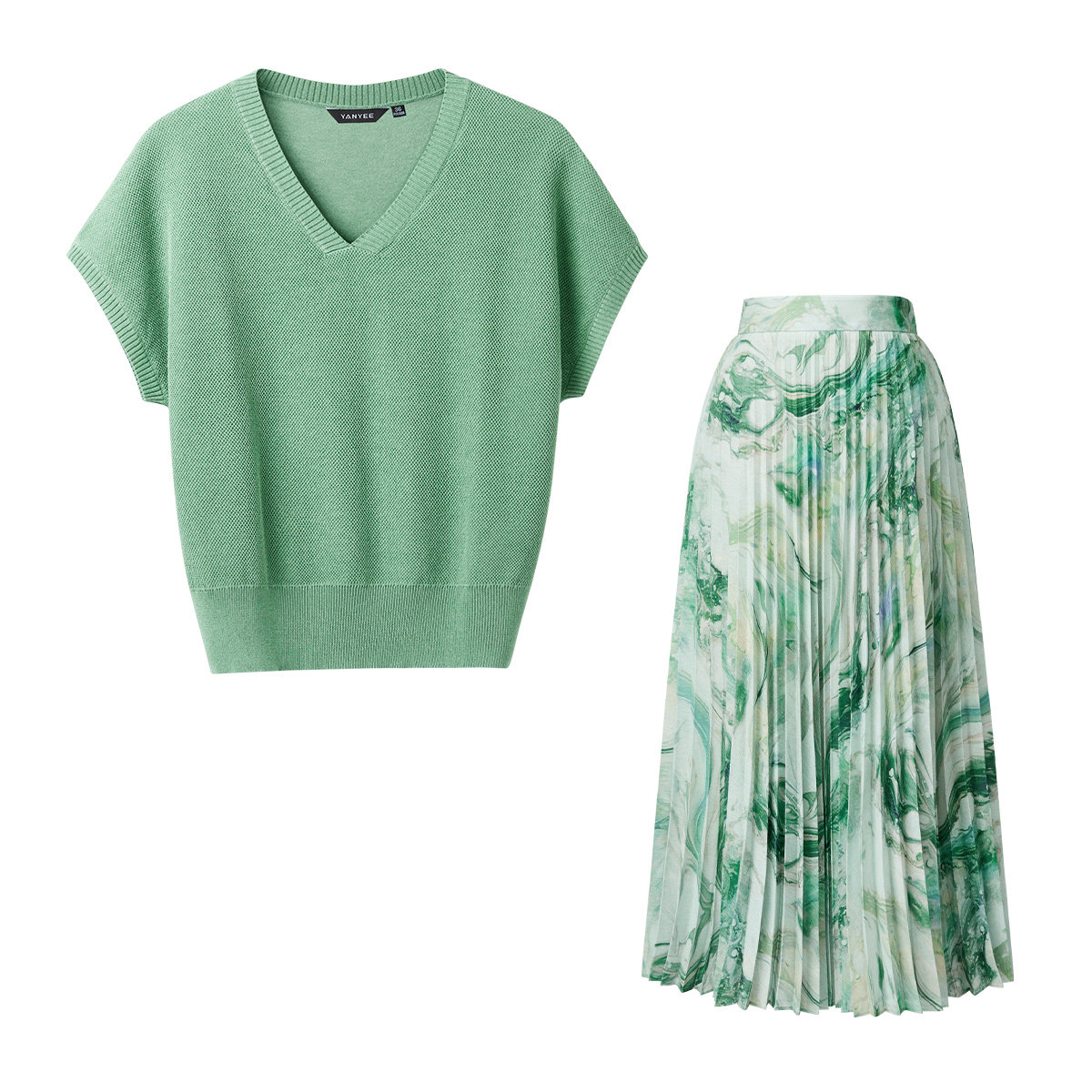 颜域绿色气质套装2026新款女装夏装搭配一整套针织衫半身裙两件套