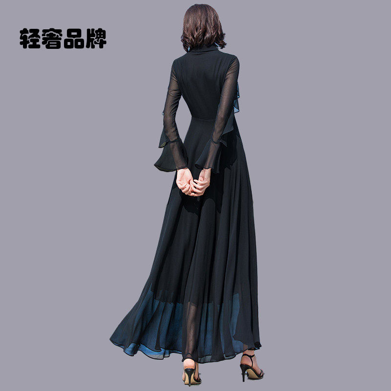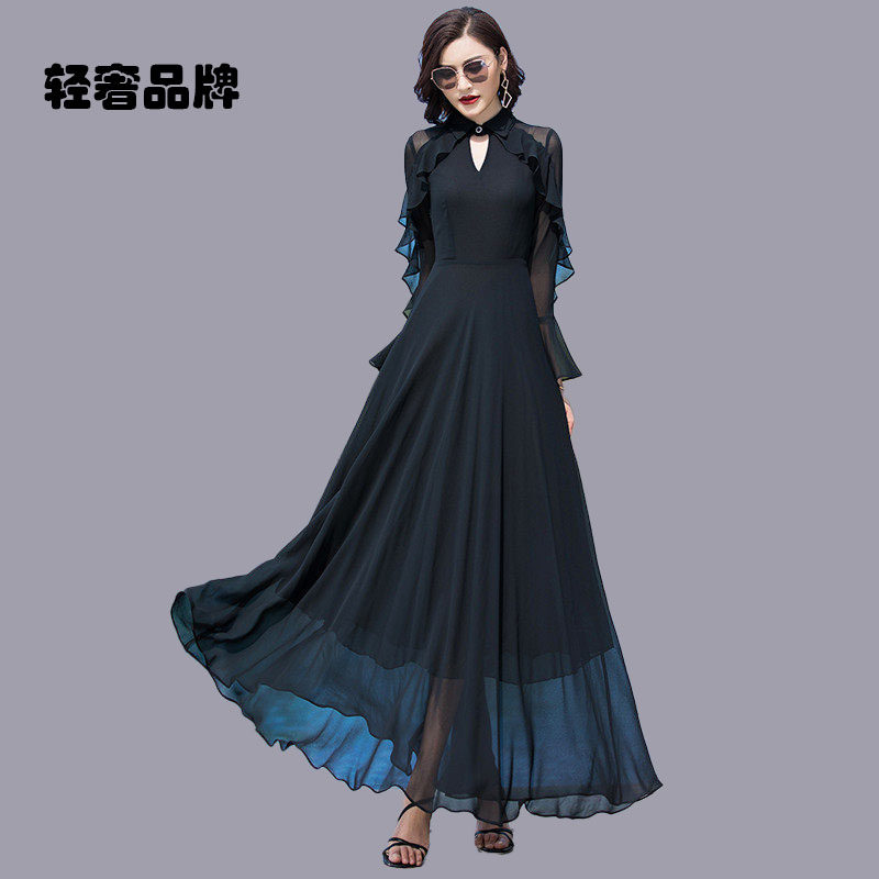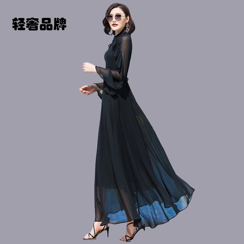 朗姿约定裙子2025年新款雪纺V领夏天收腰长裙长款大摆长袖连衣裙
