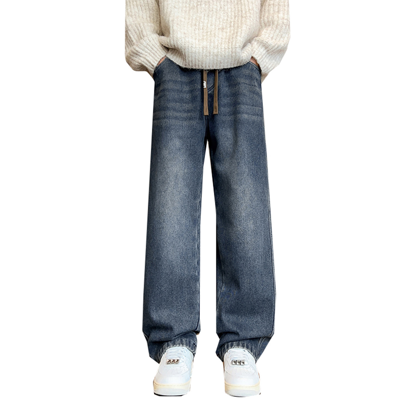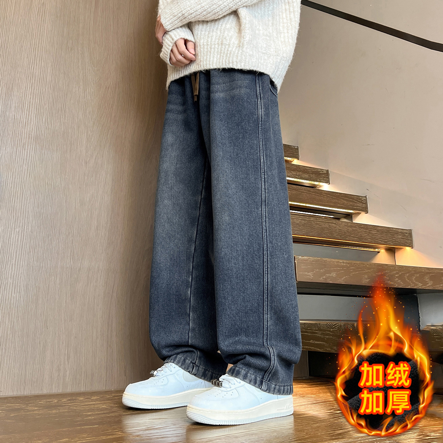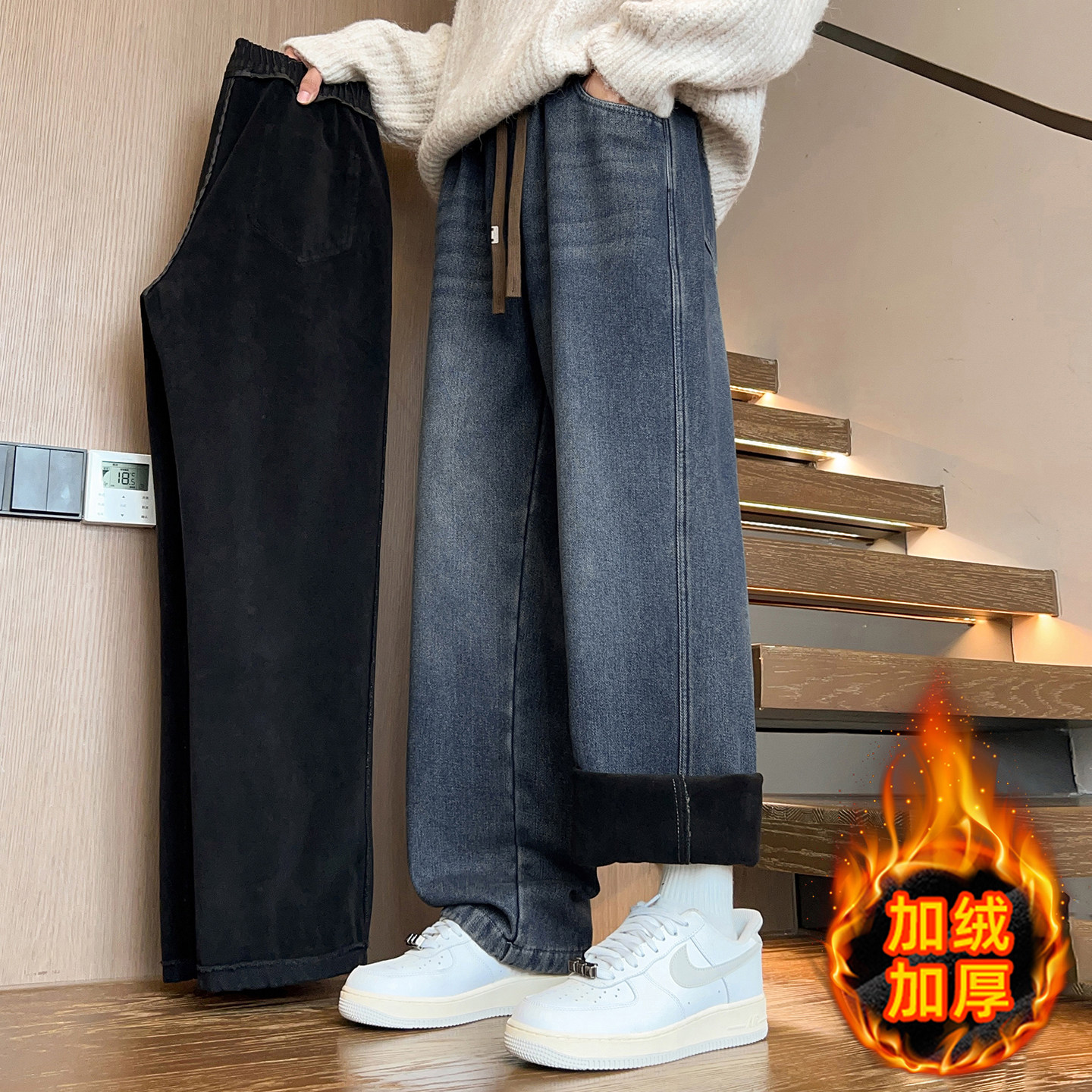 秋冬款青少年加绒加厚牛仔裤子男孩初中高中学生大童直筒阔腿长裤