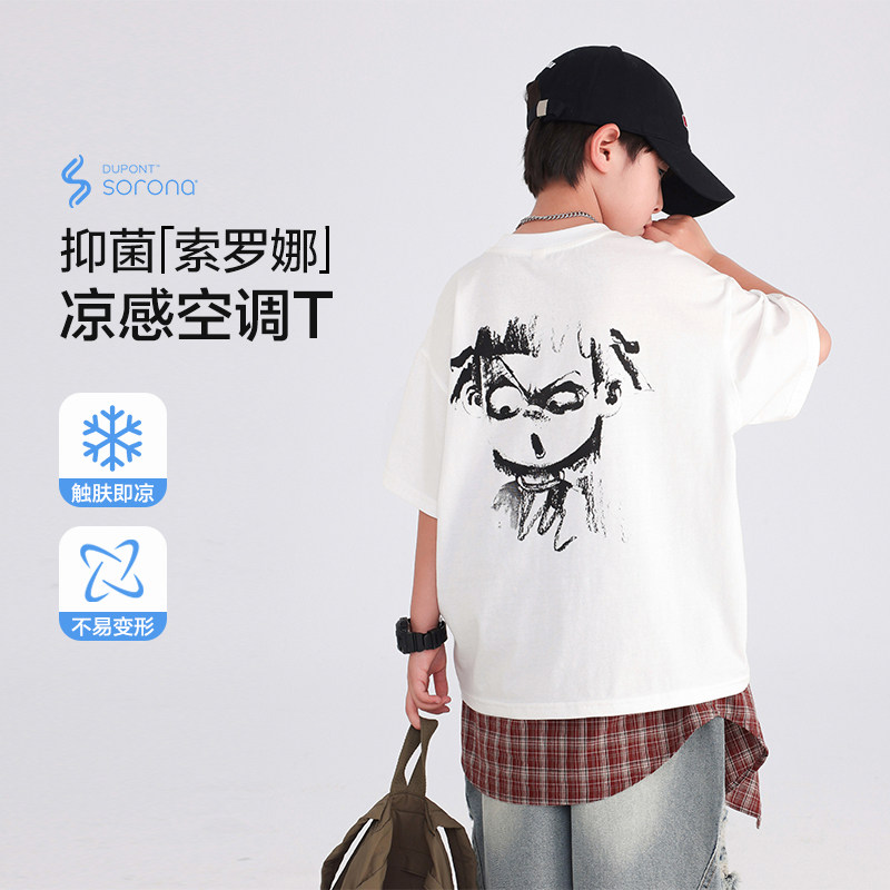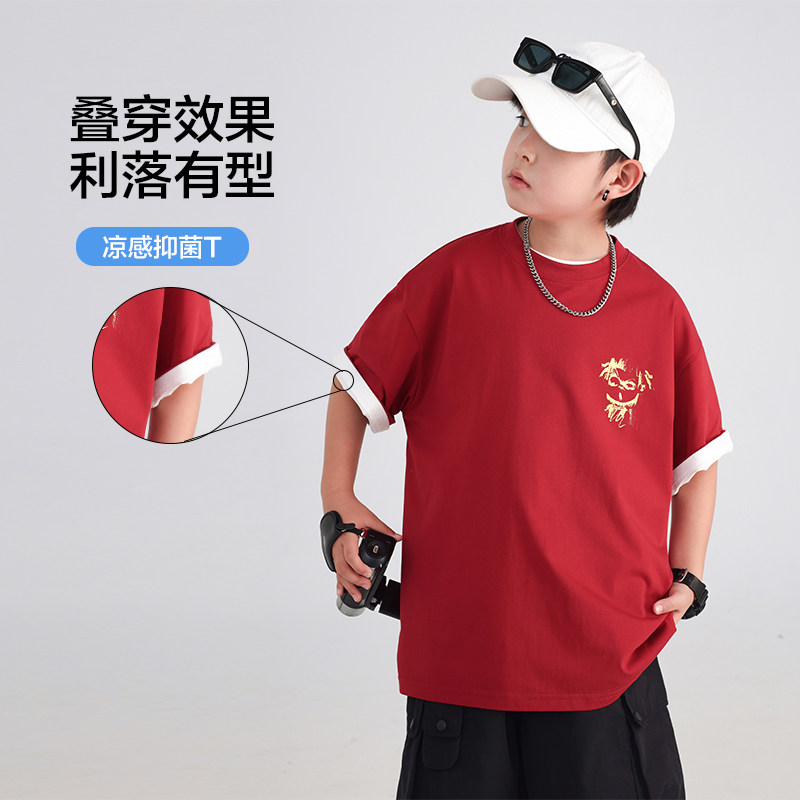 男童夏装国潮哪咤红色短袖T恤2026新款青少年儿童夏季宽松薄上衣