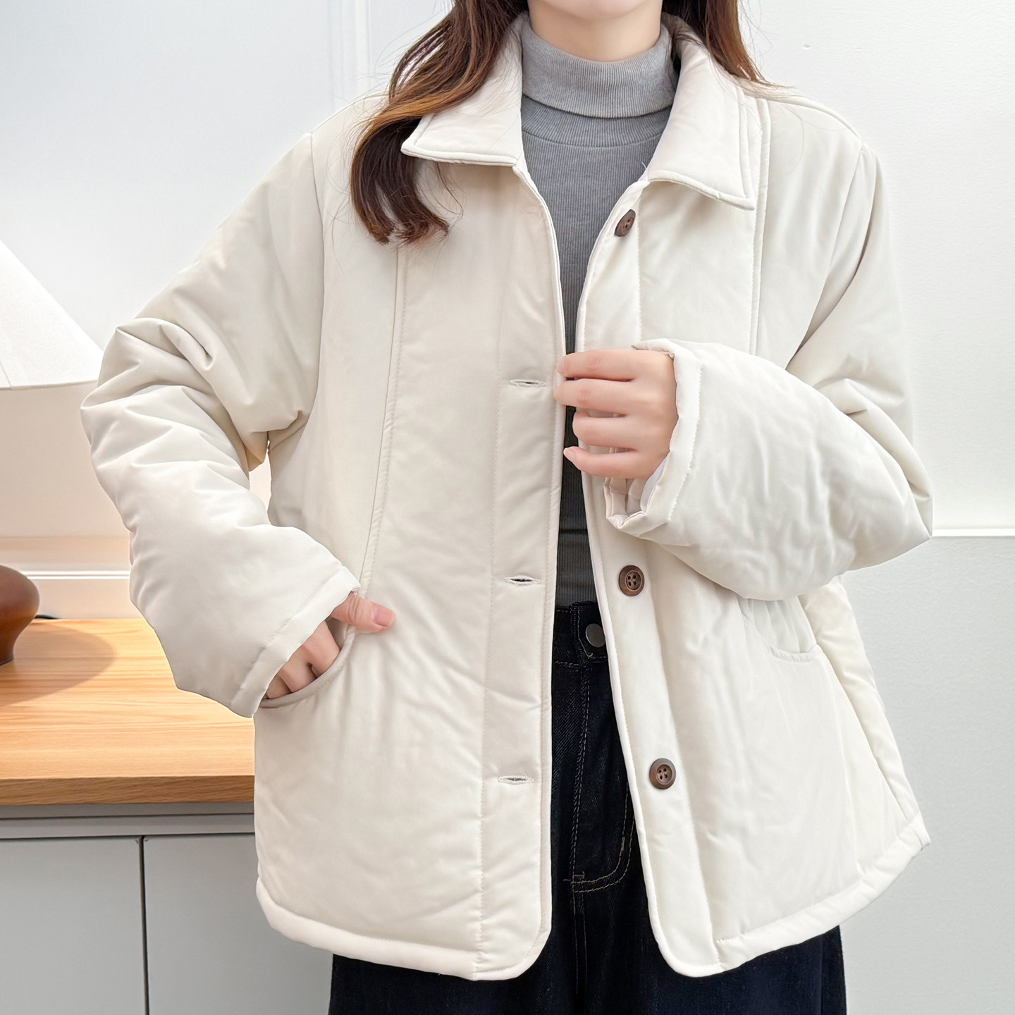 胖mm春冬季轻薄翻领棉衣简约百搭巨好看保暖外套遮肉显瘦大码女装
