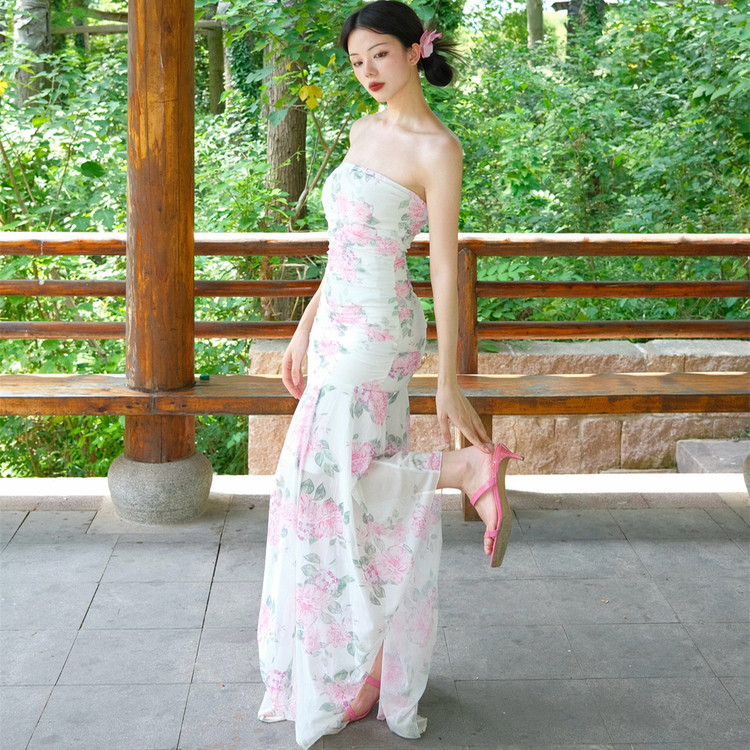 小菊川栗/素锦桃溪裙 浪漫碎花新中式抹胸连衣裙女度假风收腰长裙