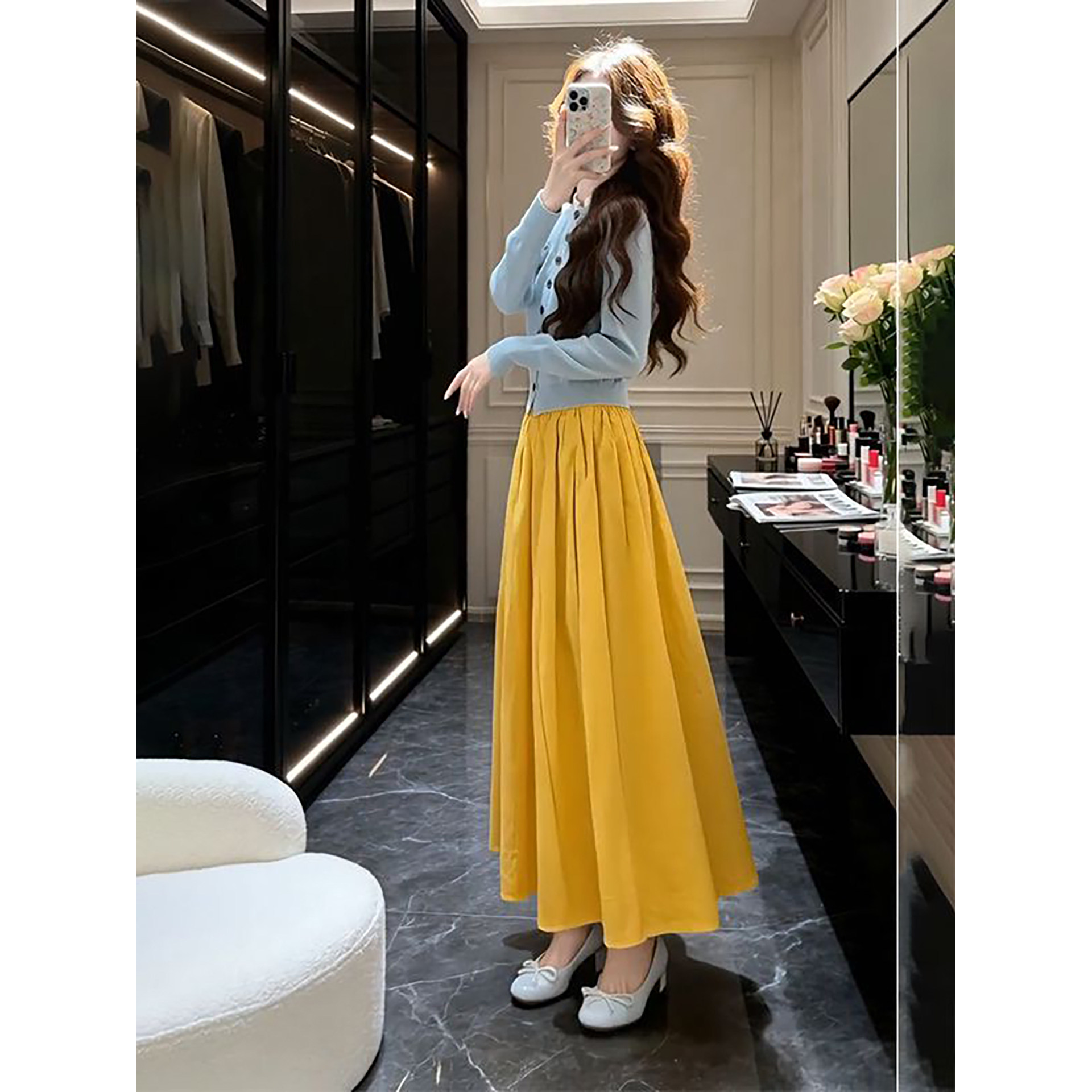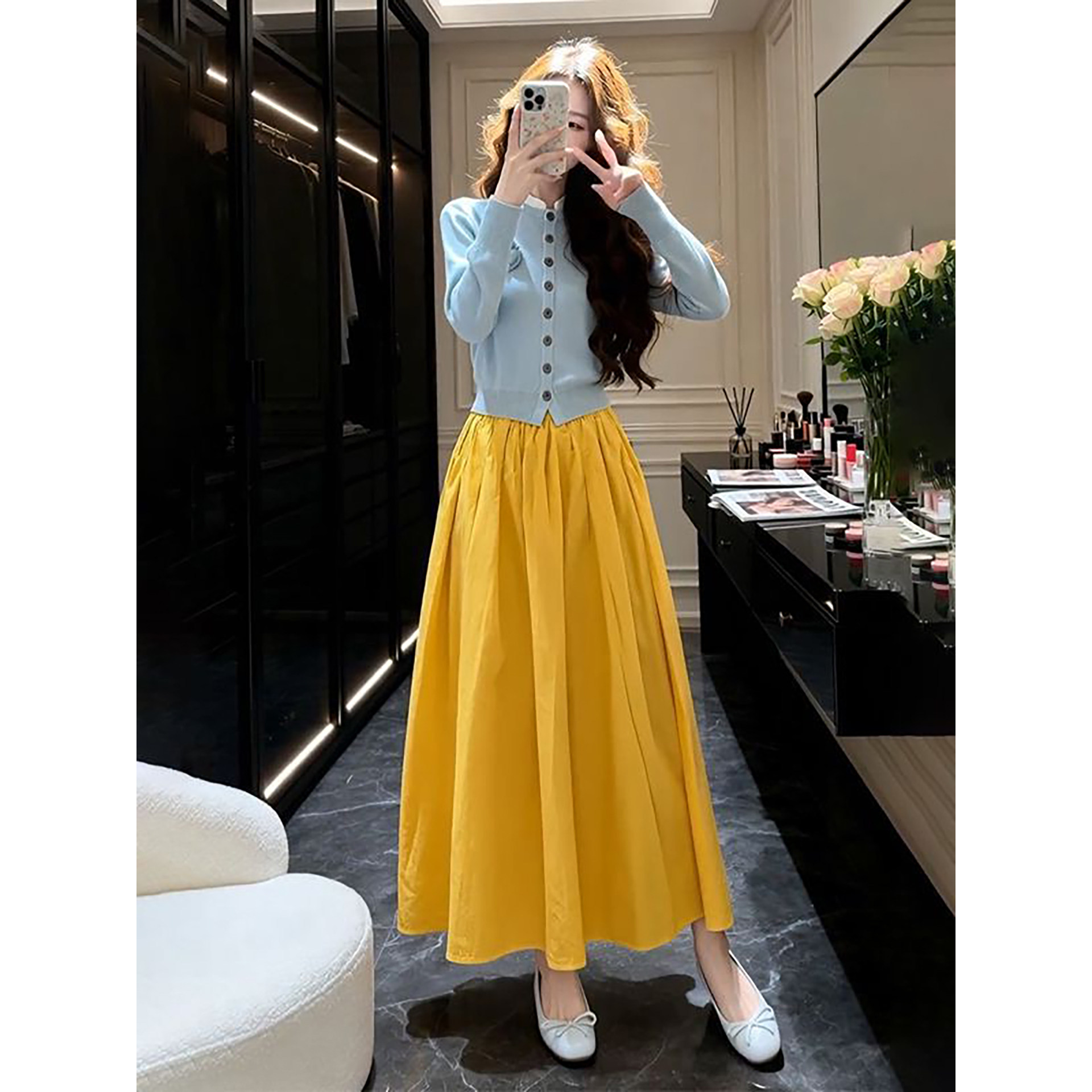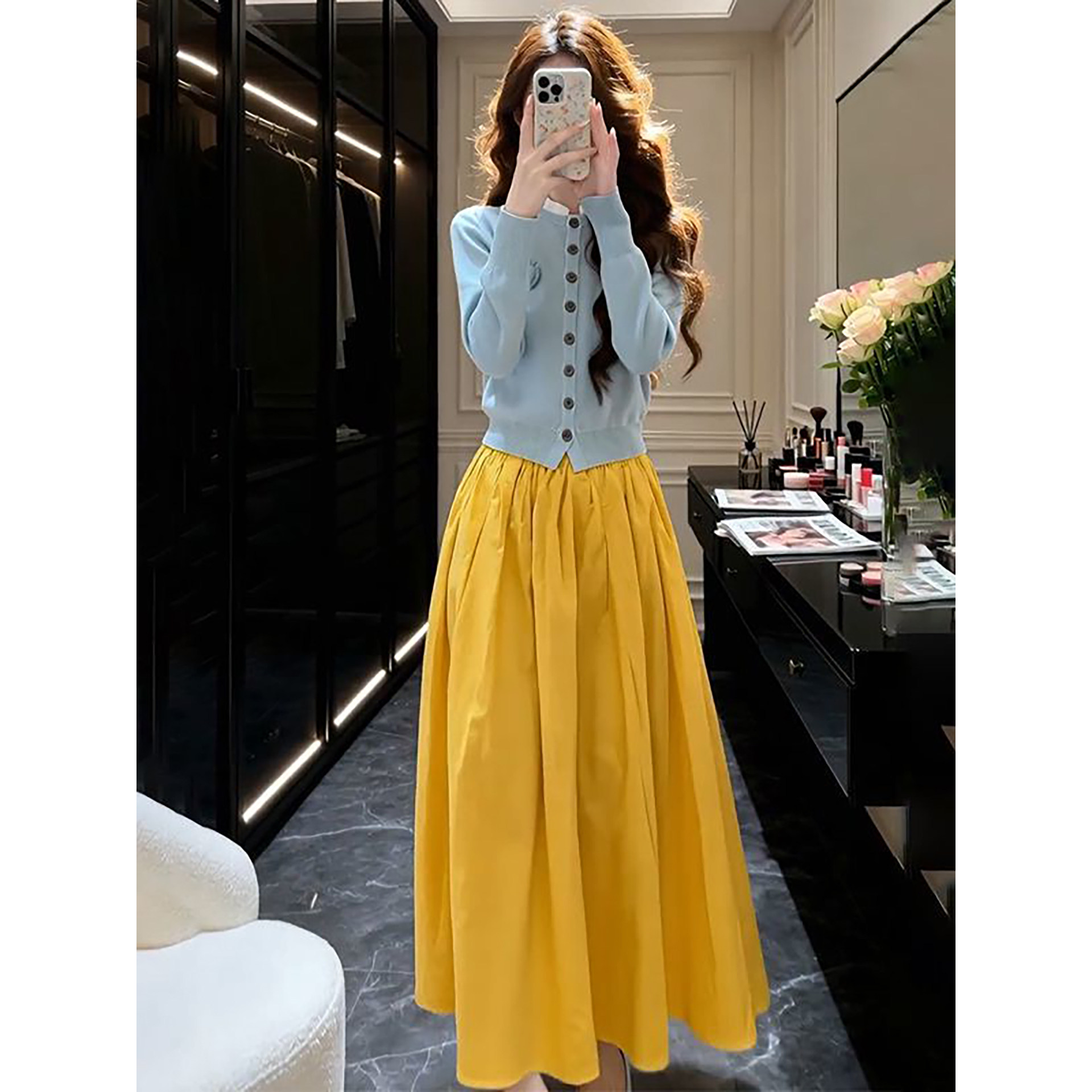 2026春季新款法式气质蓝色针织上衣女学生搭配黄色半身裙两件套装