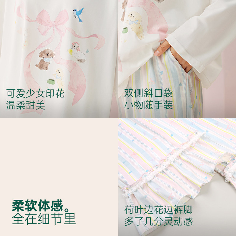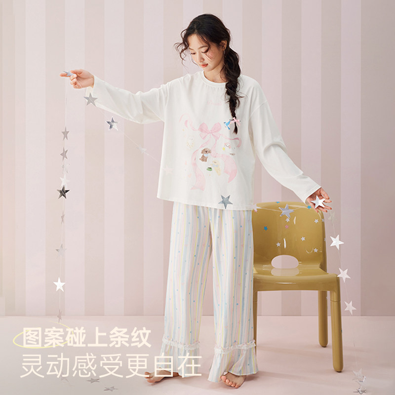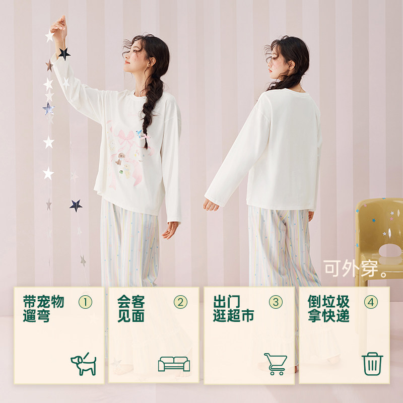 安之伴【巨柔软】睡衣女款春秋季纯棉长袖长裤可爱卡通条纹家居服