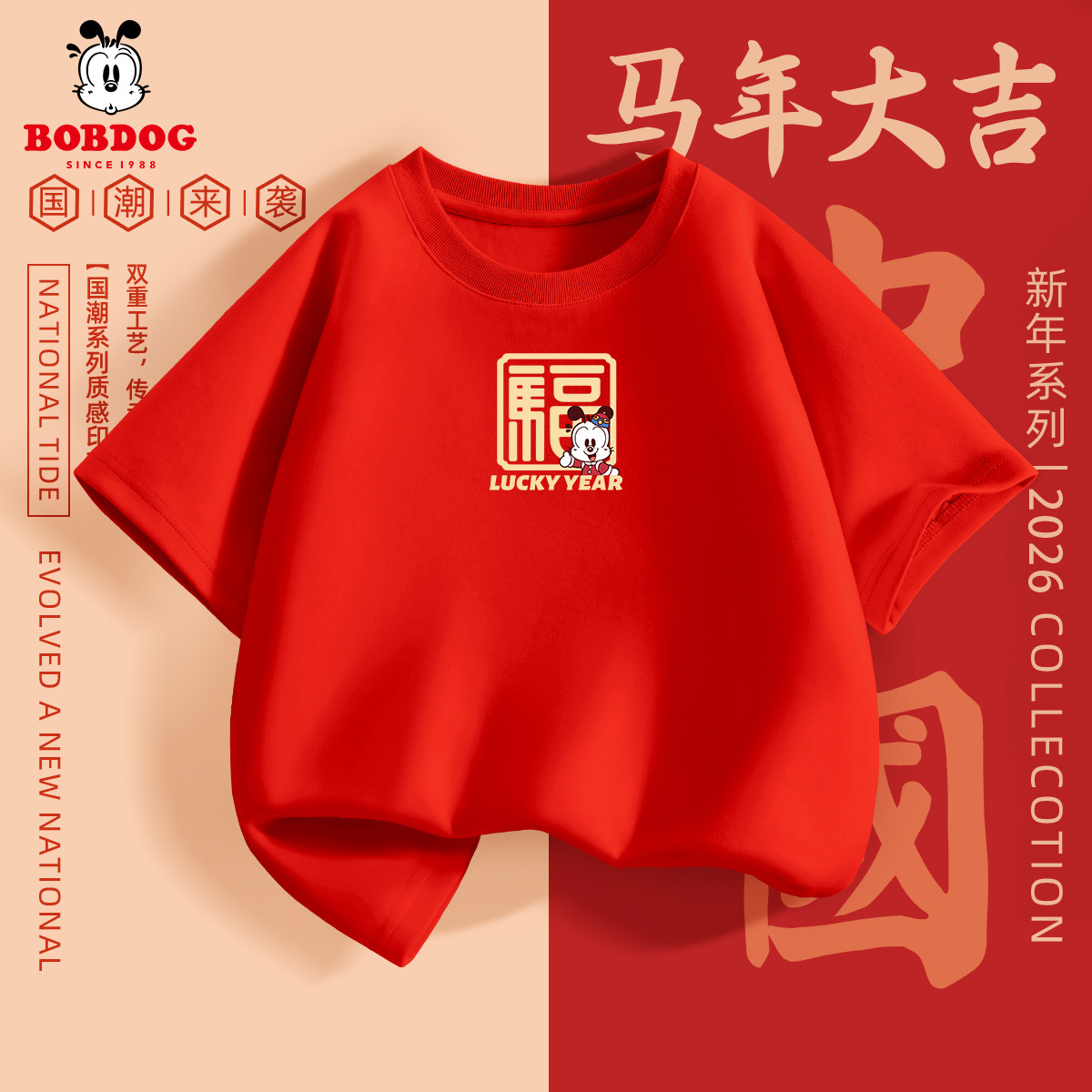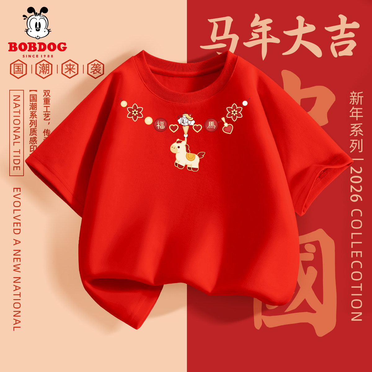 巴布豆儿童红色短袖t恤薄款2026新款拜年服男女童马年纯棉上衣夏