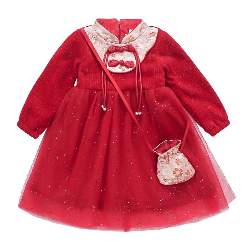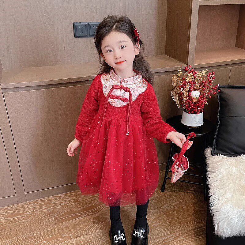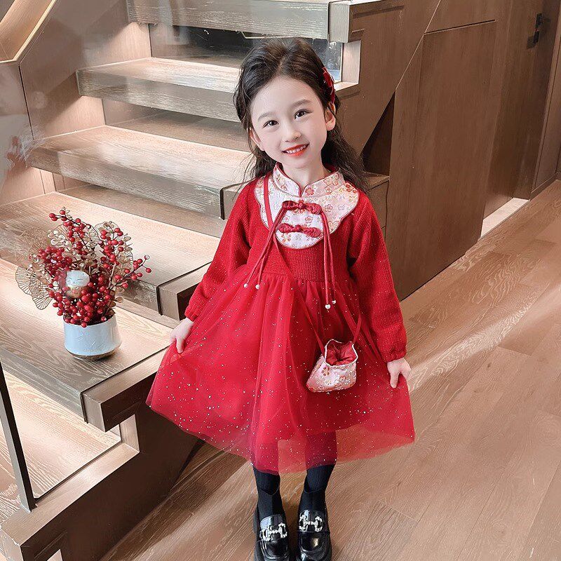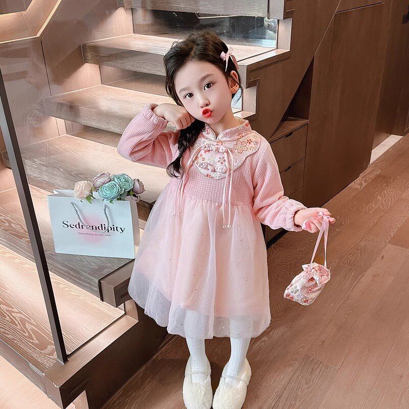 女童连衣裙秋冬款2024新款冬装儿童公主裙宝宝中国风洋气粉色裙子