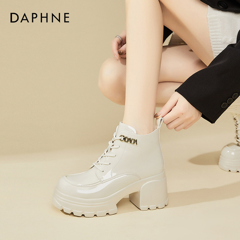 达芙妮8CM增高黑色马丁靴女秋冬款加绒小个子显瘦短靴厚底小皮鞋